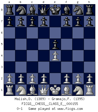 Last move : 0-1 2012 October 12 9:50:27 [Event "FICGS__CHESS__CLASS_E__000155"] [Site "FICGS"] [Date "2012.08.31"] [Round "1"] [White "Malish,Dmitriy"] [Black "Gramajo,Francisco"] [Result "0-1"] [WhiteElo "1389"] [BlackElo "1395"] 1.e4 e5 0-1 This chess game has been lost on time (started : 2012.08.31 14:49:52) King's pawn game Player Black won this chess game. Follow this game move after move (download)I'm not afraid of Spassky. The world knows I'm the best. You don't need a match to prove it. (Bobby Fischer) Wenn es im Universum noch irgendwo intelligente Lebewesen gibt, dann kennen sie Go. (Emanuel Lasker) Las leyes del Ajedrez no permiten una libre elección: tienes que mover quieras o no. (Emanuel Lasker) Avant la finale, les dieux ont créé le milieu de partie. (Tarrasch) A good book on your shelf is a friend that turns its back on you and remains a friend. (Author unknown)