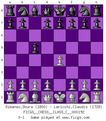 Last move : 0-1 2012 October 24 10:29:34 [Event "FICGS__CHESS__CLASS_C__000192"] [Site "FICGS"] [Date "2012.08.31"] [Round "1"] [White "Dimanov,Shura"] [Black "Laricchi,Claudio"] [Result "0-1"] [WhiteElo "1800"] [BlackElo "1728"] 1.e4 c5 0-1 This chess game has been lost on time (started : 2012.08.31 22:58:11) Sicilian defense Player Black won this chess game. Follow this game move after move (download)The defensive power of a pinned piece is only imaginary. (Aaron Nimzovich) Ich hatte meine größten Erfolge, als ich 47 Jahre alt war. Kasparow war noch nicht mal 42 und hat das Schach schon im Stich gelassen. (Viktor Kortschnoi) No existe un remordimiento como el remordimiento del Ajedrez. (H. G. Wells) Les sacrifices démontrent seulement que quelqu'un a gaffé. (Savielly Tartacover) They say poker is a zero-sum game. It must be, because every time I play my sum ends up zero. (Max Shapiro)