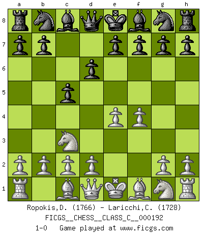 Last move : 1-0 2012 October 14 21:58:23 [Event "FICGS__CHESS__CLASS_C__000192"] [Site "FICGS"] [Date "2012.08.31"] [Round "1"] [White "Ropokis,Dimitrios"] [Black "Laricchi,Claudio"] [Result "1-0"] [WhiteElo "1766"] [BlackElo "1728"] 1.e4 c5 2.Nc3 d6 3.f4 1-0 This chess game has been lost on time (started : 2012.08.31 22:58:11) Sicilian : Closed Player White won this chess game. Follow this game move after move (download)There's never before been a Chess player with such a thorough knowledge of the intricacies of the game and such an absolutely indomitable will to win. I think Bobby is the greatest player that ever lived. (Lisa Lane) Im Fernschach kannst du während dem Spiel rauchen. (John Christen Knudsen) La única cosa que los jugadores de Ajedrez tienen en común, es el Ajedrez. (Lodewijk Prins) Il n'y a plus de joueurs du niveau de Jacob Murray dont la seule quête est le beau jeu, le plaisir de voir les pièces construire quelque chose. Sur 10 idées à la minute, 9 seront sans intérêt, la dernière s'avèrera géniale. (Christian Bauer) Never was anything great achieved without danger. (Niccolo Machiavelli)