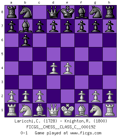 Last move : 0-1 2012 October 12 21:52:8 [Event "FICGS__CHESS__CLASS_C__000192"] [Site "FICGS"] [Date "2012.08.31"] [Round "1"] [White "Laricchi,Claudio"] [Black "Knighton,Robert"] [Result "0-1"] [WhiteElo "1728"] [BlackElo "1800"] 1.e4 b6 2.d4 Bb7 0-1 This chess game has been lost on time (started : 2012.08.31 22:58:11) Owen defense Player Black won this chess game. Follow this game move after move (download)Tactics flow from a superior position. (Bobby Fischer) Glücklicherweise sind Großmeister Ruben Fines reine Schachbücher weniger phallozentrisch [als seine Schachpsychologie] und deswegen auch weniger lächerlich. (Nigel Short) El Ajedrez tiene tanto misterio como las mujeres. (Purdy) Un millionnaire : 'Monsieur Steinitz ! Vous ne participez aux tournois que pour l'argent, alors que moi je n'y viens que pour l'honneur.' Steinitz : 'Chacun joue pour ce qu'il n'a pas'... Remember : Your focus determines your reality. (Qui-Gon Jinn in Star Wars ep.1)