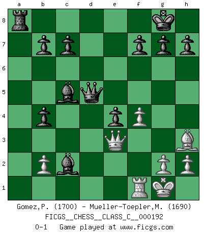 Last move : 0-1 2012 October 17 7:23:51 [Event "FICGS__CHESS__CLASS_C__000192"] [Site "FICGS"] [Date "2012.08.31"] [Round "1"] [White "Gomez,Pablo"] [Black "Mueller-Toepler,Michael"] [Result "0-1"] [WhiteElo "1700"] [BlackElo "1690"] 1.e3 d5 2.d3 e6 3.Ne2 Nc6 4.Ng3 Nf6 5.Be2 Bd6 6.Nd2 O-O 7.Nb3 e5 8.d4 Bd7 9.Bd2 exd4 10.exd4 a5 11.a4 Ne4 12.Nxe4 dxe4 13.d5 Nb4 14.Bxb4 axb4 15.Bg4 Bxa4 16.Qd4 Qg5 17.Bh3 Bxb3 18.Rxa8 Rxa8 19.O-O Bxc2 20.Qe3 Qxd5 21.f4 Bc5 0-1 Van't Kruijs Opening Kingside Castling by player Black (move 6) Kingside Castling by player White (move 19) Player Black won this chess game. Follow this game move after move (download)Chess is a terrible game. If you have no center, your opponent has a freer position. If you do have a center, then you really have something to worry about ! (Siegbert Tarrasch) Rubinstein ist ein Turmendspiel, welches die Götter vor tausenden von Jahren begannen. (Savielly Grigorievitsch Tartakower) No soy una persona materialista y por eso, no resiento la falta o pérdida del dinero. La ausencia de cosas mundanas carece de importancia. Ya que el Ajedrez es una forma en la que puedo ser tan materialista como yo desee sin tener la necesidad de vender mi alma. (Jamie Walter Adams) Le joueur d'Echecs qui veut atteindre le top est obligé de développer son propre credo créatif. Alexeï Stepanovicth Souétine. Il est facile d'écrire des livres ! Ce qui est difficile, c'est de jouer ! (Alexeï Stepanovicth Souétine) Knowledge will give you power, but character respect. (Bruce Lee)