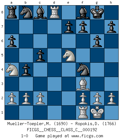 Last move : 1-0 2012 October 5 14:30:24 [Event "FICGS__CHESS__CLASS_C__000192"] [Site "FICGS"] [Date "2012.08.31"] [Round "1"] [White "Mueller-Toepler,Michael"] [Black "Ropokis,Dimitrios"] [Result "1-0"] [WhiteElo "1690"] [BlackElo "1766"] 1.e4 c5 2.Nf3 g6 3.d4 Bg7 4.d5 d6 5.Bd3 Nf6 6.O-O O-O 7.Nc3 a6 8.Bf4 Bd7 9.Qd2 b5 10.e5 dxe5 11.Nxe5 Bc8 12.Be2 b4 13.Na4 Nxd5 14.Rad1 Nxf4 15.Qxd8 Rxd8 16.Rxd8+ Bf8 17.Bf3 1-0 Sicilian : Hungarian variation Kingside Castling by player White (move 6) Kingside Castling by player Black (move 6) Player White won this chess game. Follow this game move after move (download)We must make sure that Chess will not be like a dead language, very interesting, but for a very small group. (Sytze Faber) Vielleicht wirkt die Aura früherer Spieler glanzvoller als die der heutigen Spieler, aber das liegt daran, dass man kein Programm wie Fritz hatte, das einem all die Löcher in ihren Partien zeigt. (Vladimir Kramnik) Jugadores de primera clase pierden en contra de jugadores de segunda clase porque los jugadores de segunda clase a veces juegan una partida de primer clase. (Siegbert Tarrasch) Les erreurs sont comme les malheurs, elles n'arrivent jamais seules. (Siegbert Tarrasch) To err is human, to shift the blame on someone else is tactical. (Mladen Jankovic)