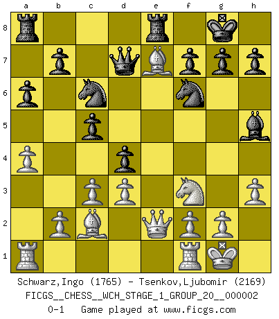 Last move : 0-1 2007 February 11 14:15:40 [Event "FICGS__CHESS__WCH_STAGE_1_GROUP_20__000002"] [Site "FICGS"] [Date "2007.01.16"] [Round "1"] [White "Schwarz,Ingo"] [Black "Tsenkov,Ljubomir"] [Result "0-1"] [WhiteElo "1765"] [BlackElo "2169"] 1.e4 c5 2.Bc4 e6 3.Qe2 Nc6 4.Nf3 a6 5.a4 Be7 6.c3 d5 7.exd5 exd5 8.Bd3 Nf6 9.O-O O-O 10.Bc2 d4 11.d3 Re8 12.Nbd2 Bg4 13.h3 Bh5 14.Ne4 Qd7 15.Bg5 Nxe4 16.Bxe7 Nf6 0-1 Sicilian defense Kingside Castling by player White (move 9) Kingside Castling by player Black (move 9) Player Black won this chess game. Follow this game move after move (download)Via the squares on the chessboard, the Indians explain the movement of time and the age, the higher influences which control the world and the ties which link Chess with the human soul. (Al-Masudi) Karpov ist ein Museumsstück. (Garry Kasparov) El Ajedrez no es una pizca de inferior al violín, y tenemos un gran número de violinistas profesionales. (Mikhail Botvinnik) Les Echecs, c'est l'art de la guerre sans les charniers, c'est la résurrection des morts tombés au champ d'honneur, l'espoir perpétuel, la suprématie de l'intelligence sur la force, la culture de l'esprit. (F. Szpiner) There's no money in correspondence chess. (John Knudsen)