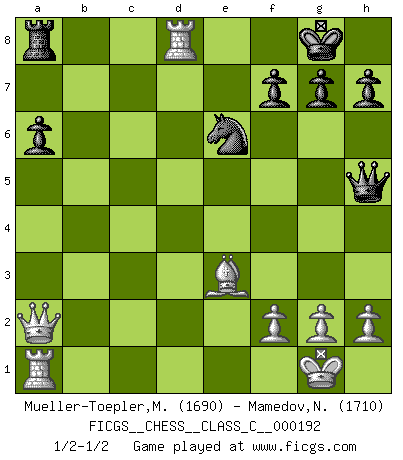 Last move : 1/2-1/2 2013 March 7 2:51:56 [Event "FICGS__CHESS__CLASS_C__000192"] [Site "FICGS"] [Date "2012.08.31"] [Round "1"] [White "Mueller-Toepler,Michael"] [Black "Mamedov,Nikita"] [Result "1/2-1/2"] [WhiteElo "1690"] [BlackElo "1710"] 1.d4 Nf6 2.c4 e6 3.Nc3 Bb4 4.e3 O-O 5.Bd3 d5 6.Nf3 c5 7.O-O Nc6 8.a3 cxd4 9.axb4 dxc3 10.bxc3 Qc7 11.Qc2 dxc4 12.Bxc4 b6 13.Bd3 Bb7 14.Rd1 Rfc8 15.Qe2 e5 16.e4 Nd8 17.c4 Ne6 18.Qb2 Bxe4 19.Bxe4 Nxe4 20.Nxe5 Nd6 21.c5 bxc5 22.bxc5 Ne4 23.Nd3 N4xc5 24.Nxc5 Qxc5 25.Be3 Qh5 26.Qa2 a6 27.Rd6 Rd8 28.Rxd8+ 1/2-1/2 Nimzo-Indian : 4.e3 O-O, 5.Bd3 d5 Kingside Castling by player Black (move 4) Kingside Castling by player White (move 7) This chess game ended in a draw. Follow this game move after move (download)The stomach is an essential part of the Chess master. (Bent Larsen) Eine Person mit durchschnittlichem IQ kann etwa eine ELO von 2000 erreichen. (Jonathan Levitt) Siempre es mejor sacrificar los hombres de tu oponente. (Savielly Tartakower) Le plus grand jeu de l'esprit jamais inventé, plus vous l'apprenez, plus vous y prenez du plaisir. (Garry Kasparov) I believe in luck. How else can you explain the success of those you dislike ? (Jean Cocteau)