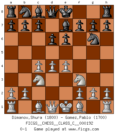 Last move : 0-1 2012 October 15 21:59:47 [Event "FICGS__CHESS__CLASS_C__000192"] [Site "FICGS"] [Date "2012.08.31"] [Round "1"] [White "Dimanov,Shura"] [Black "Gomez,Pablo"] [Result "0-1"] [WhiteElo "1800"] [BlackElo "1700"] 1.c4 e6 2.Nf3 d6 3.d4 Ne7 4.e4 Ng6 5.Nc3 Be7 0-1 This chess game has been lost on time (started : 2012.08.31 22:58:11) English Opening Player Black won this chess game. Follow this game move after move (download)Some sacrifices are sound; the rest are mine. (Mikhail Tal) Strategie ist, wie man ein Mädchen auf den Rücksitz bekommt. Taktik ist, was man tut, wenn man dann dort ist. (Anonymous) La señal de un Gran Maestro es su habilidad de ganar una partida rápidamente y sin dolor. (Irving Chernev) Nous vivons dans un monde échiquéen : chaque jour qui passe est un défi à relever. (Philosophe Sasha) Art disturbs, science reassures. (Georges Braque, Le Jour et la Nuit)