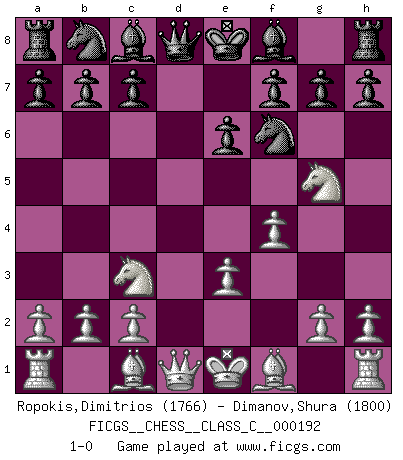 Last move : 1-0 2012 October 17 9:59:24 [Event "FICGS__CHESS__CLASS_C__000192"] [Site "FICGS"] [Date "2012.08.31"] [Round "1"] [White "Ropokis,Dimitrios"] [Black "Dimanov,Shura"] [Result "1-0"] [WhiteElo "1766"] [BlackElo "1800"] 1.e4 e6 2.f4 d5 3.Nf3 dxe4 4.Ng5 Nf6 5.Nc3 e3 6.dxe3 1-0 This chess game has been lost on time (started : 2012.08.31 22:58:11) French : Labourdonnais variation Player White won this chess game. Follow this game move after move (download)A bad day of Chess is better than any good day at work. (Anonymous) Frage des Reporters: -Worin besteht das Ziel von Gambiteröffnungen? Antwort: -Auf Kosten der Partie einen Ruf als Angriffspieler zu erwerben.- (Siegbert Tarrasch) Al jugar al Ajedrez entonces, podemos aprender: Primero: Previsión... Segundo: Prudencia... Tercero: Cautela... Y al final, aprendemos del Ajedrez el hábito de no ser desanimados por apariencias malas presentes en el estado de nuestros asuntos, el hábito de la esperanza por una oportunidad favorable y la perseveración de los secretos de los recursos. (Benjamin Franklin) La guerre est enfant de la passion, la passion est enfant du narcissisme et le narcissisme est l'enfant. (...) Une autre partie ? (Thibault de Vassal) The various flowers seem good to different people. (Chinese proverb)