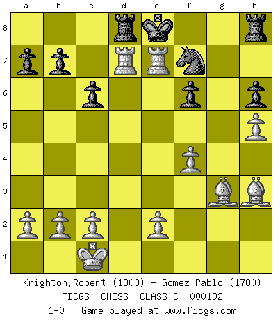 Last move : 1-0 2012 September 22 16:42:59 [Event "FICGS__CHESS__CLASS_C__000192"] [Site "FICGS"] [Date "2012.08.31"] [Round "1"] [White "Knighton,Robert"] [Black "Gomez,Pablo"] [Result "1-0"] [WhiteElo "1800"] [BlackElo "1700"] 1.g4 e6 2.d4 d6 3.Nc3 Ne7 4.Bg2 Ng6 5.Nf3 Be7 6.g5 Nd7 7.h4 h5 8.gxh6 gxh6 9.h5 Ngf8 10.Bf4 e5 11.dxe5 dxe5 12.Nxe5 Nxe5 13.Qxd8+ Bxd8 14.Bxe5 f6 15.Bg3 c6 16.O-O-O Be7 17.Ne4 Bf5 18.Rh4 Bxe4 19.Rxe4 Nd7 20.Bh3 Ne5 21.f4 Nf7 22.Rd7 Rd8 23.R4xe7+ 1-0 Comment by player 1 : Robert Knighton : 20. ... Ne5?? Checkmate in maximum of 8 more moves 23. ... Kf8 24.Rxf7+ Kg8 25.Rg7+ Kf8 26.Rdf7+ Ke8 27.Re7+ Kf8 28.Be6 Rd1+ 29.Kxd1 Rh7 30.Ref7+ Ke8 31.Rg8# Grob's attack Queenside Castling by player White (move 16) Player White won this chess game. Follow this game move after move (download)It's just you and your opponent at the board and you're trying to prove something. (Bobby Fischer) Ich glaube nicht an Psychologie, ich glaube an gute Züge. (Robert James Fischer) No es tiempo de jugar al Ajedrez cuando la casa esta en llamas. (Proverbio Italiano) Le système Elo représente seulement une moyenne. Il est simplement un indicateur de votre stabilité. (Anatoli Karpov) Opportunities multiply as they are seized. (Sun Tzu)