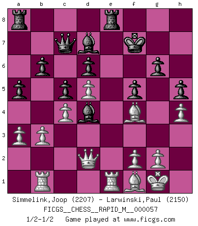 Last move : 1/2-1/2 2012 September 12 17:28:40 [Event "FICGS__CHESS__RAPID_M__000057"] [Site "FICGS"] [Date "2012.09.02"] [Round "1"] [White "Simmelink,Joop"] [Black "Larwinski,Paul"] [Result "1/2-1/2"] [WhiteElo "2207"] [BlackElo "2150"] 1.e4 e5 2.Nf3 Nc6 3.Bb5 Nf6 4.O-O Nxe4 5.Re1 Nd6 6.Nxe5 Be7 7.Bf1 O-O 8.d4 Nf5 9.d5 Nxe5 10.Rxe5 d6 11.Re1 Bd7 12.Nd2 c6 13.Ne4 Re8 14.c4 c5 15.Rb1 a5 16.Bf4 Qc7 17.Bd3 Nd4 18.b3 g6 19.Qd2 f5 20.Ng3 Bf6 21.Ne2 Nxe2+ 22.Bxe2 Be5 23.Bg5 Bd4 24.h4 h5 25.Bf1 b6 26.Bf4 Kf7 27.a3 1/2-1/2 Ruy Lopez : Berlin defense, Open variation Kingside Castling by player White (move 4) Kingside Castling by player Black (move 7) This chess game ended in a draw. Follow this game move after move (download)I guess a certain amount of temperament is expected of Chess geniuses. (Ron Gross) Mit sehr nachdenklichem Gesicht schreitet Bobby durch den Turniersaal. Was ist passiert?, fragt Lombardy. Ich stehe schlecht, antwortet Fischer. Lombardy: Dann biete doch einfach Remis an. Fischer: So schlecht stehe ich nun auch wieder nicht! (Robert James Fischer) No volvere nunca a jugar contigo. Has insultado a mi amigo. - cuando un oponente se maldijo por una mala jugada (Miguel Najdorf) Le jeu d'échecs fait naître et fortifie en nous plusieurs qualités précieuses dans le cours de l'existence, telles que la prévoyance, la circonspection, la prudence, et la persévérance. (Benjamin Franklin - 1783, la morale des échecs) Do you know these so called Volunteers don't even get paid! (Simpsons)