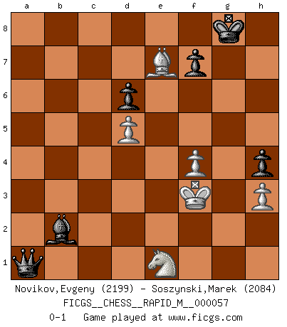 Last move : 0-1 2012 November 26 13:27:0 [Event "FICGS__CHESS__RAPID_M__000057"] [Site "FICGS"] [Date "2012.09.02"] [Round "1"] [White "Novikov,Evgeny"] [Black "Soszynski,Marek"] [Result "0-1"] [WhiteElo "2199"] [BlackElo "2084"] 1.e4 e5 2.Nf3 Nc6 3.Nc3 Nf6 4.Bb5 Bc5 5.O-O O-O 6.Nxe5 Nxe5 7.d4 Bd6 8.f4 Neg4 9.e5 Be7 10.Be2 d6 11.exf6 Nxf6 12.d5 Re8 13.Be3 c5 14.Re1 Bf8 15.Bf3 g6 16.h3 Bg7 17.Bf2 Rxe1+ 18.Qxe1 Bf5 19.Qd2 h5 20.Re1 Qd7 21.a3 Re8 22.Rxe8+ Qxe8 23.Qd1 a6 24.Kh2 b5 25.Qd2 b4 26.axb4 cxb4 27.Ne2 Be4 28.c4 bxc3 29.Nxc3 Bxf3 30.gxf3 Qb8 31.Kg3 h4+ 32.Kg2 Nh5 33.f5 Qb4 34.fxg6 Nf4+ 35.Kh2 Nxg6 36.Be3 a5 37.Nd1 Qb3 38.Kg2 a4 39.Bg5 Ne5 40.Ne3 Nd3 41.Kf1 Bxb2 42.Qc2 Ne5 43.Kg2 Qxc2+ 44.Nxc2 a3 45.f4 Nd3 46.Kf3 a2 47.Be7 Ne1+ 48.Nxe1 a1Q 0-1 Four knights : Spanish, Classical defense Kingside Castling by player White (move 5) Kingside Castling by player Black (move 5) Promotion Queen by player Black (move 48) Player Black won this chess game. Follow this game move after move (download)When asked, -How is that you pick better moves than your opponents?, I responded: I'm very glad you asked me that, because, as it happens, there is a very simple answer. I think up my own moves, and I make my opponent think up his. (Alexander Alekhine) Der Umstand, daß uns eine 7 Stunden Zeitkontrolle ermöglicht eine großartige, tiefe Partie zu spielen, ist für die Massenmedien nicht weiter von Bedeutung. (Alexej Shirov) Los errores estan ahí, esperando a que se cometan. (Savielly Tartakower) Le joueur d'Echecs qui veut atteindre le top est obligé de développer son propre credo créatif. Alexeï Stepanovicth Souétine. Il est facile d'écrire des livres ! Ce qui est difficile, c'est de jouer ! (Alexeï Stepanovicth Souétine) I live to kill Traxler counterattack. (Ilmars Cirulis)