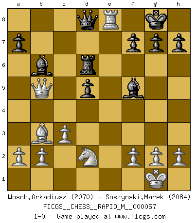 Last move : 1-0 2012 September 25 14:44:58 [Event "FICGS__CHESS__RAPID_M__000057"] [Site "FICGS"] [Date "2012.09.02"] [Round "1"] [White "Wosch,Arkadiusz"] [Black "Soszynski,Marek"] [Result "1-0"] [WhiteElo "2070"] [BlackElo "2084"] 1.e4 e5 2.Nf3 Nc6 3.Bc4 Bc5 4.c3 Nf6 5.d3 O-O 6.O-O d6 7.Bb3 Ne7 8.d4 Bb6 9.dxe5 Nxe4 10.Qe2 Nc5 11.exd6 cxd6 12.Be3 Bf5 13.Re1 Re8 14.Bxc5 Bxc5 15.Qc4 Bg6 16.Nbd2 Rc8 17.Qb5 d5 18.Ne5 Bf5 19.Qxb7 Bb6 20.Rad1 Rc7 21.Qa6 Nc6 22.Nxc6 Rxe1+ 23.Rxe1 Rxc6 24.Qb5 Rd6 25.Re8+ 1-0 Giuoco Piano Kingside Castling by player Black (move 5) Kingside Castling by player White (move 6) Player White won this chess game. Follow this game move after move (download)Botvinnik tried to take the mystery out of Chess, always relating it to situations in ordinary life. He used to call Chess a typical inexact problem similar to those which people are always having to solve in everyday life. (Garry Kasparov) Du weisst es gibt ein Problem mit Computern und Fernschach, wenn jeder eine Rating von 2450 hat. (John Christen Knudsen) Aquel que teme a un Peón de Reina aislado, debería de retirarse del Ajedrez. (Siegbert Tarrasch) Avant la finale, les dieux ont créé le milieu de partie. (Tarrasch) There will be no order, only chaos. (Sol Robeson in Pi by Darren Aronofsky)