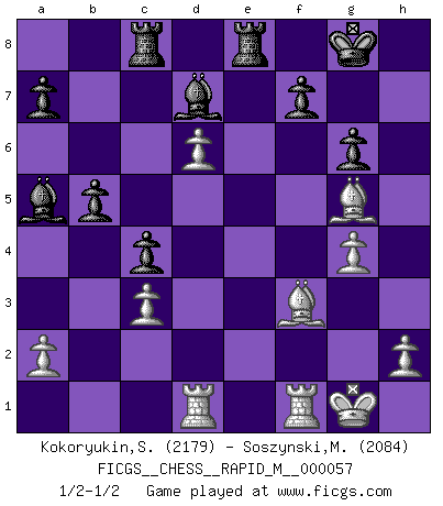 Last move : 1/2-1/2 2012 September 17 11:51:49 [Event "FICGS__CHESS__RAPID_M__000057"] [Site "FICGS"] [Date "2012.09.02"] [Round "1"] [White "Kokoryukin,Sergey"] [Black "Soszynski,Marek"] [Result "1/2-1/2"] [WhiteElo "2179"] [BlackElo "2084"] 1.d4 Nf6 2.c4 g6 3.Nc3 d5 4.cxd5 Nxd5 5.e4 Nxc3 6.bxc3 Bg7 7.Nf3 c5 8.Rb1 O-O 9.Be2 Nc6 10.d5 Ne5 11.Nxe5 Bxe5 12.Qd2 e6 13.f4 Bc7 14.O-O exd5 15.exd5 Ba5 16.d6 Rb8 17.Ba3 Bf5 18.Rbd1 Rc8 19.g4 Bd7 20.f5 Qh4 21.Bf3 Rfe8 22.Bc1 c4 23.fxg6 hxg6 24.Qg5 Qxg5 25.Bxg5 b5 1/2-1/2 King's Indian defense, 3.Nc3 Kingside Castling by player Black (move 8) Kingside Castling by player White (move 14) This chess game ended in a draw. Follow this game move after move (download)Personally, I rather look forward to a computer program winning the world Chess Championship. Humanity needs a lesson in humility. (Richard Dawkings) Ich würde mich als ganz normalen Jungen bezeichnen [Im Alter von 12]. (Sergej Karjakin) De eso se trata el Ajedrez. Un día le das una lección a tu oponente y al día siguiente el te da una a tí. (Bobby Fischer) Ne tendez aucun piège pour le plaisir ! Ne jouez rien dans l'espoir que l'adversaire réagisse de façon stupide ! Prenez toujours pour acquis que l'adversaire va trouver le meilleur coup ! Ne jouez jamais de coup dans l'espoir que l'adversaire ne voie pas la menace ! Chacun de vos coups doit améliorer la position d'une façon ou d'une autre. Unless I accept my faults I will most certainly doubt my virtues. (Hugh Prather)