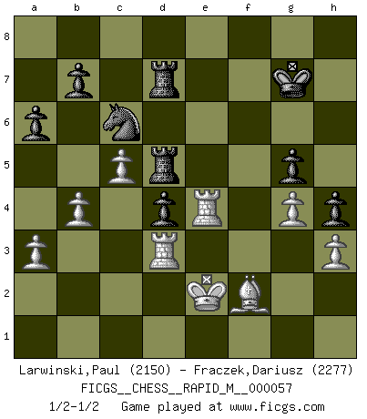 Last move : 1/2-1/2 2012 November 14 16:10:20 [Event "FICGS__CHESS__RAPID_M__000057"] [Site "FICGS"] [Date "2012.09.02"] [Round "1"] [White "Larwinski,Paul"] [Black "Fraczek,Dariusz"] [Result "1/2-1/2"] [WhiteElo "2150"] [BlackElo "2277"] 1.e4 e6 2.Nf3 d5 3.exd5 exd5 4.d4 Bd6 5.Bd3 Ne7 6.O-O Nbc6 7.c3 Bg4 8.h3 Bh5 9.Re1 Qd7 10.b4 Nd8 11.Nbd2 Ne6 12.Ne5 Bxd1 13.Nxd7 Nf4 14.Bf1 Be2 15.Nc5 Bxc5 16.dxc5 Bxf1 17.Kxf1 f6 18.Nb3 Nfg6 19.Be3 Kf7 20.Rad1 Rhe8 21.Nd4 a6 22.Nb3 h5 23.g3 c6 24.Na5 Rab8 25.c4 Red8 26.a3 h4 27.cxd5 cxd5 28.g4 Nc6 29.Nb3 Rd7 30.Nd4 Nxd4 31.Rxd4 Ne5 32.Red1 Rbd8 33.f4 Nc6 34.R4d3 d4 35.Bf2 g5 36.fxg5 fxg5 37.Re1 Rd5 38.Re4 R8d7 39.Ke2 Kf8 40.Rf3+ Kg7 41.Rd3 1/2-1/2 French defense Kingside Castling by player White (move 6) This chess game ended in a draw. Follow this game move after move (download)The most important feature of the Chess position is the activity of the pieces. This is absolutely fundamental in all phases of the game: Opening, Middlegame and especially Endgame. The primary constraint on a piece's activity is the Pawn structure. (Michael Stean) Ein Isolani verdüstert die Stimmung auf dem ganzen Schachbrett. (Savielly Grigorievitsch Tartakower) Cuando veas una buena jugada, trata de encontrar otra mejor. (Emanuel Lasker) Dans le domaine de la peinture, de la gravure et de la sculpture, dès la première décennie de notre siècle, les artistes abandonnent la représentation de la partie d'échecs pour se concentrer sur les pièces, sur les échiquiers et sur toutes les variations auxquelles les unes et les autres peuvent donner lieu. On passe en quelque sorte d'un thème social à un thème musical (au sens de la musica médiévale, c'est-à-dire d'une notion qui inclue le rythme, l'harmonie, la construction et la déconstruction, etc.). Graphiquement et picturalement, l'échiquier apparaît comme une structure ouverte, dynamique, d'une richesse infinie, autorisant toutes les combinatoires et débouchant sur des mouvements et des rythmes de nature exponentielle. (Michel Pastoureau) Establishing goals is all right if you don't let them deprive you of interesting detours. (Doug Larson)