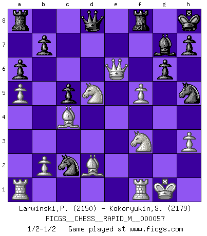 Last move : 1/2-1/2 2012 September 25 5:45:24 [Event "FICGS__CHESS__RAPID_M__000057"] [Site "FICGS"] [Date "2012.09.02"] [Round "1"] [White "Larwinski,Paul"] [Black "Kokoryukin,Sergey"] [Result "1/2-1/2"] [WhiteElo "2150"] [BlackElo "2179"] 1.e4 g6 2.d4 Bg7 3.Nc3 d6 4.f4 Nf6 5.Nf3 O-O 6.Bd3 Na6 7.O-O c5 8.d5 Bg4 9.Qe2 Nc7 10.h3 Bd7 11.a4 a6 12.a5 Nb5 13.Bd2 e6 14.dxe6 fxe6 15.Qe1 Nh5 16.f5 exf5 17.exf5 Bxf5 18.Bc4+ Kh8 19.g4 Nd4 20.gxf5 Nxc2 21.Qe6 d5 22.Nxd5 1/2-1/2 Robatsch defense : Pseudo-Austrian attack Kingside Castling by player Black (move 5) Kingside Castling by player White (move 7) This chess game ended in a draw. Follow this game move after move (download)In Chess, at least, the brave inherit the earth. (Edmar Mednis) Fischer machte Schach einfach zu einer aufregenden Sache, wann immer er sich ans Brett setzte. (Raymond Keene) Una de estas pequeñas movidas modestas pudieran ser mas molestas a tu oponente que la amenaza mas grande. (Siegbert Tarrasch) Les Echecs ne sont pas pour les âmes timides. Ils requièrent un homme entier, qui ne s'arrête pas aveuglément à ce qui a été déjà établi, mais qui tente individuellement de sonder les profondeurs du jeu. (W. Steinitz) How many people work in NATO Headquarters ? - About half of them. (Dirk Stikker, NATO general secretary)