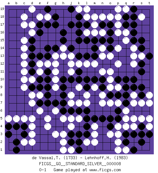 Last move : 0-1 2013 May 6 17:29:51 [Event "FICGS__GO__STANDARD_SILVER__000008"] [Site "FICGS"] [Date "2012.09.02"] [Round "2"] [Black "de Vassal,Thibault"] [White "Lehnhoff,Heinz-Georg"] [Result "0-1"] [Rating 1 "1733"] [Rating 2 "1983"] 1.r3 d16 2.r17 d3 3.q10 d5 4.k3 h3 5.k17 m17 6.o17 q16 7.q17 p16 8.o16 p17 9.r16 p18 10.r15 o18 11.g17 c13 12.d18 c17 13.n5 l16 14.k16 f18 15.f17 e18 16.e17 d17 17.g18 c18 18.f19 d19 19.f14 r12 20.r10 p12 21.q18 o13 22.c4 d4 23.c3 c2 24.b2 c5 25.b4 b5 26.a3 o10 27.p8 s13 28.s14 f12 29.f8 d10 30.h8 h14 31.h15 j15 32.h16 g13 33.g14 n8 34.k8 d8 35.h4 o7 36.p6 p7 37.q7 q6 38.r6 r7 39.q8 q5 40.p5 q4 41.q3 p4 42.o5 s7 43.s6 s5 44.s4 r5 45.t6 t5 46.s8 p3 47.q2 m3 48.l5 t4 49.s2 j13 50.s11 r8 51.r9 t7 52.s12 r14 53.t13 p2 54.t3 j4 55.j3 g3 56.g4 j5 57.l4 f4 58.g5 g6 59.k6 m12 60.j6 l7 61.h6 h5 62.g7 f5 63.k11 g10 64.h10 g9 65.h9 l8 66.o8 n7 67.l9 k7 68.n9 m9 69.m10 r13 70.s15 k9 71.l10 l2 72.j2 l18 73.k18 j16 74.j17 m4 75.m5 d2 76.b1 a5 77.a4 k19 78.j19 o9 79.n10 n11 80.k10 h2 81.k15 k12 82.l15 m16 83.m15 l19 84.n15 q15 85.e13 e12 86.d13 c14 87.d12 c12 88.d11 c11 89.o14 p14 90.e7 d7 91.f10 g11 92.e10 e11 93.d9 c10 94.e9 c9 95.k13 l12 96.j14 h13 97.l13 q19 98.r19 n13 99.f13 j12 100.e16 e6 101.d15 c15 102.o4 o3 103.p10 o11 104.n17 n18 105.f11 g12 106.f7 p9 107.q9 e8 108.f9 p19 109.l3 m2 110.l17 m18 111.d14 s18 112.r18 j8 113.s9 q1 114.r1 p1 115.m13 r4 116.s3 k5 117.l6 j11 118.j10 n16 119.o15 j7 120.h7 n14 121.m14 j1 122.k1 h1 123.k2 t8 0-1 Here are the names of the openings (joseki) played in the four corners : Corner q16 : r17 m17 San-San (Sam-Sam, San-San) 3-3 Point. The San-San (3-3) point, emphasizing territory at the expense of influence. Corner d16 : d16 g17 Hoshi (Hwajeom, Seongjeom, Xingwei`) 4-4 Point. The star or hoshi (4-4) point, emphasizing influence at the potential expense of territory. Niken Kakari (Dukan Keolch'im, E`r Gua`jiao~, 2-Space Low Approach). White typically answers by 7-3 or 3-5 (which is not joseki). Player White won this Go (weiqi, baduk) game. Follow this game move after move (download)When in doubt, remove the enemy stones from the board. (Bill Taylor) Luck never gives; it only lends. (Swedish proverb)