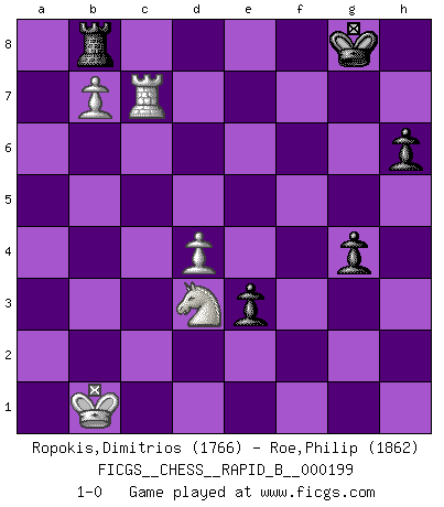 Last move : 1-0 2012 November 30 3:19:26 [Event "FICGS__CHESS__RAPID_B__000199"] [Site "FICGS"] [Date "2012.09.03"] [Round "1"] [White "Ropokis,Dimitrios"] [Black "Roe,Philip"] [Result "1-0"] [WhiteElo "1766"] [BlackElo "1862"] 1.e4 e5 2.f4 d5 3.exd5 exf4 4.Nf3 Nf6 5.d4 Nxd5 6.Bc4 Be7 7.O-O O-O 8.Bxd5 Qxd5 9.Bxf4 c6 10.Nc3 Qd8 11.Qd3 Be6 12.Rae1 Nd7 13.Ne4 Bf5 14.Qb3 Qb6 15.Bd6 Qxb3 16.axb3 Bxd6 17.Nxd6 Bxc2 18.Re7 Nf6 19.Rxb7 Rfb8 20.Ne5 Bxb3 21.Nxc6 Rxb7 22.Nxb7 Re8 23.Ne5 Bd5 24.Nc5 Rb8 25.Ned3 Re8 26.Nf4 Bc6 27.Ra1 Re7 28.Ncd3 Bb5 29.Nc5 g5 30.Nfd3 Re2 31.Rxa7 Bc6 32.Ra6 Rxg2+ 33.Kf1 Ng4 34.Rxc6 Ne3+ 35.Ke1 Nc2+ 36.Kd1 Ne3+ 37.Kc1 Rc2+ 38.Kb1 Rxh2 39.Ne4 h6 40.b4 Rh4 41.Ndf2 f5 42.b5 Nd5 43.Rc5 fxe4 44.Rxd5 e3 45.Nd3 Re4 46.b6 Re8 47.b7 Rb8 48.Rd7 g4 49.Rc7 1-0 KGD : Falkbeer counter-gambit Kingside Castling by player White (move 7) Kingside Castling by player Black (move 7) 10 pieces endgame at move 44 : White KRNPP , Black KRPPP WHITE : King + 1 Rook 1 Knight 2 Pawns BLACK : King + 1 Rook 3 Pawns Player White won this chess game. Follow this game move after move (download)When you are lonely, when you feel yourself an alien in the world, play Chess. This will raise your spirits and be your counselor in war. (Aristotle) Schach ist wie eine schöne Frau, zu der wir ständig zurückkehren, gleichviel, wie oft sie uns zurückweist. (Anonymous) Bobby solo arroja las piezas y solas caen en las casillas correctas. (Miguel Najdorf ) Les erreurs sont comme les malheurs, elles n'arrivent jamais seules. (Siegbert Tarrasch) A computer lets you make more mistakes faster than any invention in human history - with the possible exceptions of handguns and tequila. (Mitch Ratcliffe)