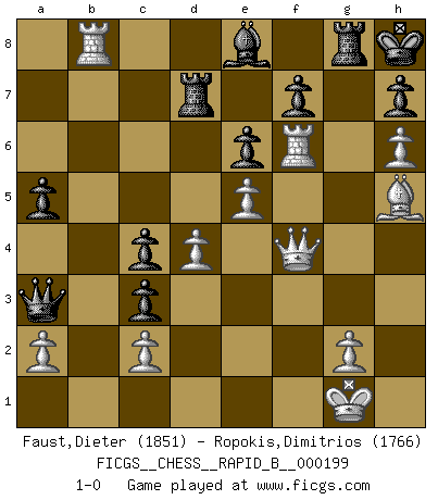 Last move : 1-0 2012 October 24 13:48:30 [Event "FICGS__CHESS__RAPID_B__000199"] [Site "FICGS"] [Date "2012.09.03"] [Round "1"] [White "Faust,Dieter"] [Black "Ropokis,Dimitrios"] [Result "1-0"] [WhiteElo "1851"] [BlackElo "1766"] 1.d4 Nf6 2.Nc3 g6 3.Nf3 Bg7 4.Bf4 d5 5.e3 O-O 6.Be2 e6 7.h4 Ne4 8.h5 g5 9.h6 Nxc3 10.bxc3 Bf6 11.Bg3 c5 12.Rb1 Nc6 13.Qd2 c4 14.Nh2 a6 15.Bh5 Be7 16.Ng4 b5 17.Ne5 Nxe5 18.dxe5 Bd7 19.f4 Kh8 20.Rd1 gxf4 21.Bxf4 Be8 22.Bf3 Bc6 23.O-O Bc5 24.Qe1 Rg8 25.Bh5 Be8 26.Rd2 Qe7 27.Rf3 b4 28.Qf2 a5 29.Bg3 Qd8 30.Bh4 Be7 31.Bf6+ Bxf6 32.Rxf6 bxc3 33.Rd1 Qe7 34.Rb1 d4 35.exd4 Rd8 36.Rb6 Rd7 37.Rb8 Qa3 38.Qf4 1-0 Queen's pawn game Kingside Castling by player Black (move 5) Kingside Castling by player White (move 23) Player White won this chess game. Follow this game move after move (download)I like to say that Bobby Fischer was the greatest player ever. But what made Fischer a genius was his ability to blend an American freshness and pragmatism with Russian ideas about strategy. (Bruce Pandolfini) Habe Mut, dich deines eigenen Verstandes zu bedienen. (Immanuel Kant) Una mala movida nulifica cuarenta buenas. (Horowitz) Que feriez-vous si vous étiez en train de jouer aux échecs et que la fin du monde arrive ? Je continuerais à jouer. (Saint Borromée) To steal ideas from one person is plagiarism. To steal from many is research. (Unknown)