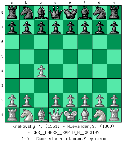Last move : 1-0 2012 October 3 21:16:11 [Event "FICGS__CHESS__RAPID_B__000199"] [Site "FICGS"] [Date "2012.09.03"] [Round "1"] [White "Krakovsky,Peter"] [Black "Alexander,Steven"] [Result "1-0"] [WhiteElo "1561"] [BlackElo "1800"] 1.c4 1-0 This chess game has been lost on time (started : 2012.09.03 10:2:46) English Opening Player White won this chess game. Follow this game move after move (download)Capture of the adverse King is the ultimate but not the first object of the game. (William Steinitz) Schach ist Krieg, im Schach geht es um testosterongesteuerte Urschreie. (Garry Kasparov) Peones: ellos son el alma de esta partida, solos forman el ataque y la defensa. (Philidor) RxDa4 pat (...) A woman without a man is like a fish without a bicycle. (Gloria Steinem)