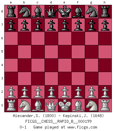 Last move : 0-1 2012 October 3 21:16:11 [Event "FICGS__CHESS__RAPID_B__000199"] [Site "FICGS"] [Date "2012.09.03"] [Round "1"] [White "Alexander,Steven"] [Black "Kepinski,Janusz"] [Result "0-1"] [WhiteElo "1800"] [BlackElo "1648"] 0-1 This chess game has been lost on time (started : 2012.09.03 10:2:46) Player Black won this chess game. Follow this game move after move (download)The Chess pieces are the block alphabet which shapes thoughts; and these thoughts, although making a visual design on the chessboard, express their beauty abstractly, like a poem. (Marcel Duchamp) Aljechin war kein Nazi. Er war ein Opportunist. Ein schrecklicher Mann. Er liebte Geld über alles und würde für Geld ein Jude, ein Katolik oder ein Protestant werden. (Miguel Najdorf) No hay un Gran Maestro de Ajedrez que sea normal; solo se diferencían ellos por la magnitud de su locura. (Viktor Korchnoi) La guerre est enfant de la passion, la passion est enfant du narcissisme et le narcissisme est l'enfant. (...) Une autre partie ? (Thibault de Vassal) It's unlucky to be superstitious. (Dave Enteles)