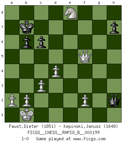 Last move : 1-0 2012 December 21 12:39:51 [Event "FICGS__CHESS__RAPID_B__000199"] [Site "FICGS"] [Date "2012.09.03"] [Round "1"] [White "Faust,Dieter"] [Black "Kepinski,Janusz"] [Result "1-0"] [WhiteElo "1851"] [BlackElo "1648"] 1.d4 Nf6 2.Nc3 d5 3.Bg5 c6 4.Nf3 Ne4 5.Bd2 Bf5 6.g3 e6 7.Nh4 Nxd2 8.Qxd2 a5 9.Nxf5 exf5 10.Qf4 Qb6 11.O-O-O Nd7 12.Qxf5 g6 13.Qf4 f5 14.g4 fxg4 15.Qxg4 O-O-O 16.e4 dxe4 17.Nxe4 Kb8 18.Bc4 Bh6+ 19.Kb1 Qc7 20.c3 Rde8 21.Rde1 Re7 22.Qh4 Nb6 23.Nc5 Rxe1+ 24.Rxe1 Nxc4 25.Qxh6 Nd6 26.Qf4 Nf5 27.Re5 Kc8 28.Ne6 Qb8 29.Qe4 Re8 30.Rxa5 Nd6 31.Qg4 b6 32.Re5 Nf5 33.Rxf5 gxf5 34.Qxf5 Qxh2 35.Ng7 Kb7 36.Nxe8 1-0 Queen's pawn game Queenside Castling by player White (move 11) Queenside Castling by player Black (move 15) Player White won this chess game. Follow this game move after move (download)I had a toothache during the first game. In the second game I had a headache. In the third game it was an attack of rheumatism. In the fourth game, I wasn't feeling well. And in the fifth game? Well, must one have to win every game ? (Siegbert Tarrasch) Über Kasparov: Es ist offensichtlich, daß er in einem totalitären Staat aufwuchs und deshalb zu diktatorischen Zügen neigt. (Viktor Kortschnoi) La pasion por jugar al Ajedrez es una de las mas inexplicables en el mundo. (H.G. Wells) Si le désir cupide (et stupide) de gagner est une inépuisable source de souffrance, une combinaison brillante sur l'échiquier est une découverte : le coquelicot qui s'épanouit lorsque apparaît la Voie Lactée. (Arrabal) It's not enough to succeed. Others must fail. (Gore Vidal)