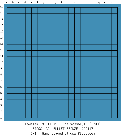 Last move : 0-1 2012 September 3 16:39:30 [Event "FICGS__GO__BULLET_BRONZE__000117"] [Site "FICGS"] [Date "2012.09.03"] [Round "1"] [Black "Kowalski,Mateusz"] [White "de Vassal,Thibault"] [Result "0-1"] [Rating 1 "1045"] [Rating 2 "1733"] 0-1 This go game has been lost on time (started : 2012.09.03 12:42:59) Here are the names of the openings (joseki) played in the four corners : Player White won this Go (weiqi, baduk) game. Follow this game move after move (download)Go is to western chess what philosophy is to double entry accounting. (from Shibumi, by Trevanian) There are three kinds of lies: lies, damned lies and statistics. (Mark Twain)