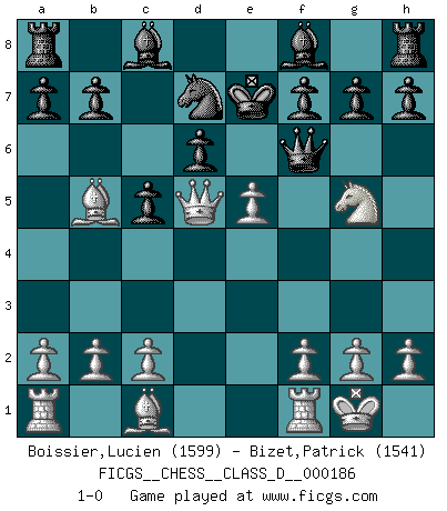 Last move : 1-0 2012 October 2 12:37:42 [Event "FICGS__CHESS__CLASS_D__000186"] [Site "FICGS"] [Date "2012.09.05"] [Round "1"] [White "Boissier,Lucien"] [Black "Bizet,Patrick"] [Result "1-0"] [WhiteElo "1599"] [BlackElo "1541"] 1.d4 Nf6 2.Nf3 c5 3.d5 e6 4.Nc3 exd5 5.Nxd5 Nxd5 6.Qxd5 d6 7.e4 Nc6 8.Ng5 Qf6 9.Bc4 Ne5 10.Bb5+ Ke7 11.O-O Nd7 12.e5 1-0 Queen's pawn game Kingside Castling by player White (move 11) Player White won this chess game. Follow this game move after move (download)Not only will I predict his triumph over Botvinnik, but I'll go further and say that he'll probably be the greatest Chess player that ever lived. (John Collins) Gott hat gewollt, dass ich Champion werde. (Surab Azmajparaschvili) Aquellos que dicen entender al Ajedrez, no entienden nada. (Robert Hubner) Le moment que je préfère le plus dans une rencontre, c'est celui où je sens que la personnalité de l'adversaire se brise. (Robert Fischer) Watch your thoughts; they become words. Watch your words; they become actions. Watch your actions; they become habits. Watch your habits; they become character. Watch your character; it becomes your destiny. (Frank Outlaw)