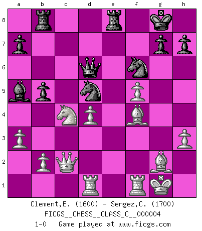 Last move : 1-0 2006 August 15 18:58:11 [Event "FICGS__CHESS__CLASS_C__000004"] [Site "FICGS"] [Date "2006.05.16"] [Round "1"] [White "Clement,Etienne"] [Black "Sengez,Christophe"] [Result "1-0"] [WhiteElo "1600"] [BlackElo "1700"] 1.d4 d5 2.c4 e6 3.Nc3 c5 4.cxd5 exd5 5.Nf3 Nc6 6.g3 c4 7.Bg2 Bb4 8.O-O Nge7 9.e4 dxe4 10.Nxe4 O-O 11.Qc2 Bf5 12.Be3 Rc8 13.a3 Ba5 14.Rad1 Nd5 15.Nh4 Bg4 16.Nf3 Nce7 17.h3 Bh5 18.g4 Bg6 19.Ne5 b5 20.Bc1 Re8 21.f4 Bxe4 22.Bxe4 Nf6 23.Bb7 Rb8 24.Bg2 Qd6 25.g5 Nfd5 26.f5 f6 27.gxf6 Nxf6 28.Bf4 Ned5 29.Nxc4 1-0 QGD : Tarrasch, Folkestone (Swedish) variation Kingside Castling by player White (move 8) Kingside Castling by player Black (move 10) Player White won this chess game. Follow this game move after move (download)Strategy requires thought, tactics require observation. (Max Euwe) Irgendwie scheint mir sonntags früh um 9 Uhr der Killerinstinkt verloren gegangen zu sein. (Alexej Shirov) La captura del Rey enemigo es la finalidad pero no el primer objetivo de la partida. (William Steinitz) Vous n'êtes pas toujours obligé de jouer le meilleur coup. Un coup doit être actif, entreprenant, correct et beau ! (David Bronstein) If you lose the game you should win the analysis! (Proverb)