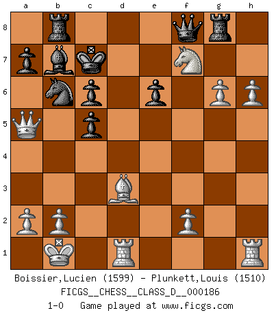 Last move : 1-0 2012 December 11 10:53:5 [Event "FICGS__CHESS__CLASS_D__000186"] [Site "FICGS"] [Date "2012.09.05"] [Round "1"] [White "Boissier,Lucien"] [Black "Plunkett,Louis"] [Result "1-0"] [WhiteElo "1599"] [BlackElo "1510"] 1.d4 f5 2.Nc3 Nf6 3.Bg5 e6 4.e4 fxe4 5.Nxe4 Be7 6.Bxf6 Bxf6 7.Qh5+ g6 8.Qh6 Bxd4 9.O-O-O Bf6 10.Nf3 Qe7 11.Nxf6+ Qxf6 12.h4 Rf8 13.Kb1 Nc6 14.Bb5 Ne7 15.Ng5 Nf5 16.Qxh7 c6 17.Bd3 Rh8 18.Ne4 Qf8 19.Qxg6+ Kd8 20.g4 Ne7 21.Qg5 Rg8 22.Qa5+ b6 23.Qh5 Nd5 24.g5 Kc7 25.g6 Nf4 26.Qe5+ d6 27.Qc3 Nd5 28.Qb3 Bb7 29.h5 Qh6 30.c4 Nf4 31.c5 bxc5 32.Nxd6 Rab8 33.Nf7 Qf8 34.Qa4 Nd5 35.Qa5+ Nb6 36.h6 1-0 Dutch Queenside Castling by player White (move 9) Player White won this chess game. Follow this game move after move (download)There is no remorse like the remorse of Chess. (H. G. Wells) Du kannst im Schach nur gut werden, wenn du das Spiel liebst. (Robert James Fischer) Fischer era un maestro de claridad y un Rey del posicionamiento astuto. Sus oponentes podían ver hacia donde se dirigía pero eran impotentes para detenerlo. (Bruce Pandolfini) Il n'y a pas de prix trop élevé au scalp de l'ennemi. (Koblentz) To send light into the darkness of men's hearts - such is the duty of the artist. (Schumann)