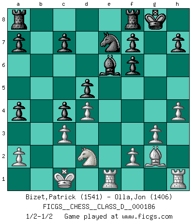 Last move : 1/2-1/2 2012 November 6 6:26:33 [Event "FICGS__CHESS__CLASS_D__000186"] [Site "FICGS"] [Date "2012.09.05"] [Round "1"] [White "Bizet,Patrick"] [Black "Olla,Jon"] [Result "1/2-1/2"] [WhiteElo "1541"] [BlackElo "1406"] 1.Nf3 Nf6 2.d4 d5 3.c4 dxc4 4.Nc3 e6 5.Bg5 Bb4 6.Qa4+ Nc6 7.O-O-O Bxc3 8.bxc3 Qd5 9.Bxf6 gxf6 10.Nd2 b5 11.e4 bxa4 12.exd5 exd5 13.Re1+ Ne7 14.g3 Be6 15.Bg2 O-O 16.h4 1/2-1/2 Reti Opening Queenside Castling by player White (move 7) Kingside Castling by player Black (move 15) This chess game ended in a draw. Follow this game move after move (download)Later, I began to succeed in decisive games. Perhaps because I realized a very simple truth: not only was I worried, but also my opponent. (Mikhail Tal) Die Arbeit ist etwas Unnatürliches. Die Faulheit allein ist göttlich. (Anatole France) El Ajedrez es en su esencia, un juego. En su forma, un arte. Y en su ejecución, una ciencia. (Baron Tassilo) Même si l'adversaire joue le coup analysé précédemment, recommencez l'analyse en voyant la nouvelle position. Première règle de Blumenfeld Programmer - an organism that turns coffee into software. (Anonymous)