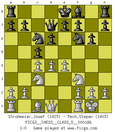 Last move : 1-0 2012 November 14 10:38:15 [Event "FICGS__CHESS__CLASS_D__000186"] [Site "FICGS"] [Date "2012.09.05"] [Round "1"] [White "Strohmeier,Josef"] [Black "Pech,Stepan"] [Result "1-0"] [WhiteElo "1429"] [BlackElo "1403"] 1.e4 c5 2.Nf3 d6 3.Bb5+ Bd7 4.Bxd7+ Qxd7 5.c4 Nc6 6.Nc3 Nf6 7.O-O g6 8.d4 1-0 This chess game has been lost on time (started : 2012.09.05 4:13:20) Sicilian : Canal-Sokolsky attack, Sokolsky variation Kingside Castling by player White (move 7) Player White won this chess game. Follow this game move after move (download)By the beauty of his games, the clarity of his play, and the brilliance of his ideas, Fischer made himself an artist of the same stature as Brahms, Rembrandt, and Shakespeare. (David Levy) Pläne sind die Träume des Verständigen. (Ernst Freiherr von Feuchtersleben) Yo tuve un dolor de muelas en la primer partida. En el segundo juego, tuve un dolor de cabeza. En el tercero, tuve un ataque de reumatísmo. En la cuarta partida, no me sentía muy bien. ¿Y en el quinto juego? Bueno, ¿que acaso uno tiene que ganar todos los juegos?. (Siegbert Tarrasch) Il vaut mieux sacrifier les pièces de l'adversaire. (Xavier Tartacover) Depression is just anger without enthusiasm. (Unknown)