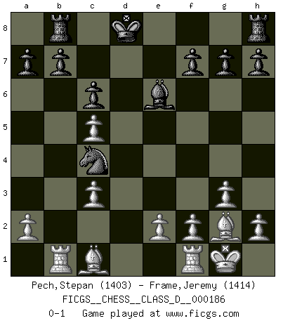 Last move : 0-1 2012 November 29 23:22:34 [Event "FICGS__CHESS__CLASS_D__000186"] [Site "FICGS"] [Date "2012.09.05"] [Round "1"] [White "Pech,Stepan"] [Black "Frame,Jeremy"] [Result "0-1"] [WhiteElo "1403"] [BlackElo "1414"] 1.c4 e5 2.Nc3 Nf6 3.Nf3 Nc6 4.g3 d5 5.cxd5 Nxd5 6.Bg2 Be6 7.O-O Bc5 8.Nxe5 Nxe5 9.d4 Nxc3 10.bxc3 Nc4 11.dxc5 c6 12.Rb1 Rb8 13.Qxd8+ Kxd8 0-1 This chess game has been lost on time (started : 2012.09.05 4:13:20) English Opening Kingside Castling by player White (move 7) Player Black won this chess game. Follow this game move after move (download)If Chess is a science, it's a most inexact one. If Chess is an art, it is too exacting to be seen as one. If Chess is a sport, it's too esoteric. If Chess is a game, it's too demanding to be just a game. If Chess is a mistress, she's a demanding one. If Chess is a passion, it's a rewarding one. If Chess is life, it's a sad one. (Unknown) Wenn Capablanka heute auf der Schachbühne erscheinen würde, hätte er ein halbes Jahr gebraucht um sich die Schachtheorie anzueignen. Und dann hätte er alles und jeden besiegt. (Mikhail Moiseyevich Botvinik) El jugador táctico debe saber que hacer cuando algo se debe de hacer. El estratégico debe saber que hacer cuando nada se debe de hacer. (Savielly Tartakover) Une platitude souvent récitée à propos des Echecs est qu'une des choses les plus difficiles à réaliser est de gagner une position gagnante. Cela ne manque pas de sens mais, pour ma part, j'ai toujours trouvé plus difficile de gagner une position perdante. (Tim Krabbe) Go and wake up your luck. (Persian saying)