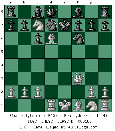 Last move : 1-0 2012 September 21 15:36:17 [Event "FICGS__CHESS__CLASS_D__000186"] [Site "FICGS"] [Date "2012.09.05"] [Round "1"] [White "Plunkett,Louis"] [Black "Frame,Jeremy"] [Result "1-0"] [WhiteElo "1510"] [BlackElo "1414"] 1.d4 d5 2.e4 dxe4 3.f3 exf3 4.Qxf3 Nf6 5.Nc3 Qxd4 6.Be3 Qd8 7.Rd1 Nbd7 8.Bf4 e6 9.Nb5 e5 10.Bxe5 c6 11.Nc7+ Ke7 12.Bd6+ 1-0 Blackmar gambit Player White won this chess game. Follow this game move after move (download)Chess is a fighting game which is purely intellectual and includes chance. (Richard Reti) Ich glaube nicht an Psychologie, ich glaube an gute Züge. (Robert James Fischer) Con o sin el título, Bobby Fischer fue sin lugar a dudas el mas grande jugador de su época. (Burt Hochberg) La solitude du joueur d'Echecs à l'approche du mat est semblable à celle du condamné. (Francis Szpiner) Programming can only do so much before it becomes too much. (Don Groves)