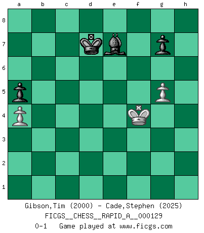 Last move : 0-1 2012 December 20 19:25:33 [Event "FICGS__CHESS__RAPID_A__000129"] [Site "FICGS"] [Date "2012.09.07"] [Round "1"] [White "Gibson,Tim"] [Black "Cade,Stephen"] [Result "0-1"] [WhiteElo "2000"] [BlackElo "2025"] 1.e4 c5 2.Nc3 a6 3.Nf3 d6 4.d4 cxd4 5.Nxd4 Nf6 6.Be3 e5 7.Nf3 Be7 8.Bc4 O-O 9.Ng5 Ng4 10.Bxf7+ Rxf7 11.Nxf7 Kxf7 12.Qd5+ Kg6 13.O-O h6 14.Qd2 Nxe3 15.Qxe3 Be6 16.Nd5 Bxd5 17.exd5 Kh7 18.c4 Nd7 19.g3 Qe8 20.Rae1 Qg6 21.f4 Bf6 22.Qe2 Re8 23.Qf3 Qf5 24.fxe5 Qxf3 25.Rxf3 Nxe5 26.Rfe3 Rc8 27.b3 Bg5 28.Rxe5 dxe5 29.Rxe5 b5 30.Re4 Kg6 31.Kg2 Kf7 32.Kf3 Rc5 33.Kg4 bxc4 34.bxc4 Bf6 35.Kf5 Ra5 36.Re2 Ra3 37.Rc2 Rd3 38.Ke4 Rd4+ 39.Kf3 Ke7 40.Re2+ Kd7 41.Re4 Rd2 42.Re2 Rxe2 43.Kxe2 Kd6 44.Kd3 Kc5 45.a3 a5 46.a4 h5 47.h3 Be5 48.g4 hxg4 49.hxg4 Bf6 50.Ke4 Kxc4 51.d6 Kc5 52.d7 Kd6 53.Kf4 Kxd7 54.g5 Be7 0-1 Sicilian : Closed Kingside Castling by player Black (move 8) Kingside Castling by player White (move 13) 10 pieces endgame at move 48 : White KPPPP , Black KBPPP WHITE : King + 4 Pawns BLACK : King + 1 Bishop 3 Pawns 9 pieces endgame at move 49 : White KPPPP , Black KBPP WHITE : King + 4 Pawns BLACK : King + 1 Bishop 2 Pawns 8 pieces endgame at move 50 : White KPPP , Black KBPP WHITE : King + 3 Pawns BLACK : King + 1 Bishop 2 Pawns 7 pieces endgame at move 53 : White KPP , Black KBPP WHITE : King + 2 Pawns BLACK : King + 1 Bishop 2 Pawns Player Black won this chess game. Follow this game move after move (download)The Pin is mightier than the sword. (Fred Reinfeld) Viele Opfer benötigen überhaupt keine konkrete Berechnung. Es genügt sich die entstehende Position kurz vorzustellen, um uns davon zu überzeugen, dass das Opfer korrekt ist. (Mikhail Nekhemyevich Tal) Si pudieramos observar el interior de la cabeza de un jugador de Ajedrez, encontraríamos ahí un mundo lleno de sentimientos, imágenes, ideas, emoción y pasión. (Alfred Binet) Le pion, dans sa simplicité, marche droit devant lui, mais lorsqu'il prend, il le fait obliquement? Ainsi l'homme, tant qu'il reste pauvre, marche dans la droiture et vit honnêtement, mais lorsqu'il recherche les honneurs, il flatte, se parjure et, par les voies obliques, cherche une position supérieure sur l'échiquier du monde. (Jean de Galles) Art is not a thing, it is a way. (Elbert Hubbard)
