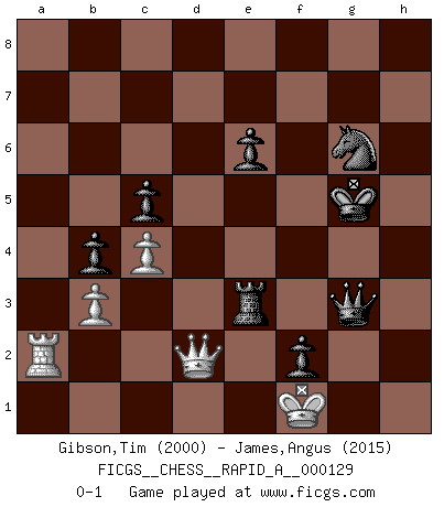 Last move : 0-1 2013 March 1 5:20:9 [Event "FICGS__CHESS__RAPID_A__000129"] [Site "FICGS"] [Date "2012.09.07"] [Round "1"] [White "Gibson,Tim"] [Black "James,Angus"] [Result "0-1"] [WhiteElo "2000"] [BlackElo "2015"] 1.e4 c5 2.Nf3 d6 3.Bc4 Nf6 4.d3 Nc6 5.O-O Bg4 6.c3 e6 7.h3 Bh5 8.Bf4 d5 9.exd5 Nxd5 10.Bg3 Be7 11.Nbd2 O-O 12.a3 a6 13.Qe2 b5 14.Ba2 Qb6 15.Rfe1 Rfd8 16.Ne4 Ra7 17.a4 Rad7 18.Bb3 b4 19.a5 Nxa5 20.Ba4 Ra7 21.c4 Nf6 22.Ned2 Nc6 23.Nb3 Nd4 24.Nbxd4 Rxd4 25.Be5 Rd8 26.g4 Bg6 27.Red1 R7a8 28.Bg3 Bd6 29.Ne5 Bxe5 30.Bxe5 Nd7 31.Bg3 Rac8 32.Qe3 Nf8 33.b3 h5 34.f3 f6 35.f4 hxg4 36.hxg4 f5 37.Bf2 fxg4 38.Ra2 Bf5 39.Rad2 Rd4 40.Qg3 Rcd8 41.Bxd4 Rxd4 42.Be8 Qc7 43.Ra1 g5 44.Rxa6 gxf4 45.Qh4 Qg7 46.Bc6 f3 47.Qg3 Qh6 48.R6a2 Qe3+ 49.Qf2 Qe5 50.Be4 Bxe4 51.dxe4 Rxe4 52.Rd1 Ng6 53.Rd8+ Kf7 54.Rd1 Re3 55.Qd2 g3 56.Qd7+ Kf6 57.Rf1 Kg5 58.Qd2 f2+ 59.Rxf2 gxf2+ 60.Kf1 Qg3 0-1 Sicilian Kingside Castling by player White (move 5) Kingside Castling by player Black (move 11) Player Black won this chess game. Follow this game move after move (download)Chess is above all, a fight ! (Emanuel Lasker) Obwohl ich alt bin, darf mir niemand den Finger in den Mund stecken, sonst beisse ich. (Wilhelm Steinitz) Yo tuve un dolor de muelas en la primer partida. En el segundo juego, tuve un dolor de cabeza. En el tercero, tuve un ataque de reumatísmo. En la cuarta partida, no me sentía muy bien. ¿Y en el quinto juego? Bueno, ¿que acaso uno tiene que ganar todos los juegos?. (Siegbert Tarrasch) Les Cavaliers se révèlent fort utiles dans les positions fermées. D'habitude, les Fous sont un peu plus forts que les Cavaliers dans les positions ouvertes. Qu'on le veuille ou non, il restera toujours des exceptions ! I find television to be very educating. Every time somebody turns on the set, I go in the other room and read a book. (Groucho Marx)