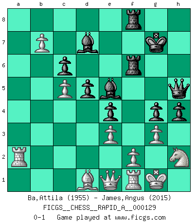 Last move : 0-1 2012 October 25 13:36:15 [Event "FICGS__CHESS__RAPID_A__000129"] [Site "FICGS"] [Date "2012.09.07"] [Round "1"] [White "Ba,Attila"] [Black "James,Angus"] [Result "0-1"] [WhiteElo "1955"] [BlackElo "2015"] 1.Nf3 d5 2.b3 Nf6 3.e3 c5 4.Be2 Nc6 5.Bb2 e6 6.O-O Bd6 7.d4 cxd4 8.Nxd4 O-O 9.c4 a6 10.Nxc6 bxc6 11.Nd2 Qe7 12.Qc2 Bb7 13.h3 Nd7 14.Nf3 f5 15.Rac1 e5 16.b4 Rac8 17.c5 Bb8 18.a4 Rf6 19.Nh4 Rcf8 20.b5 axb5 21.axb5 g5 22.Nf3 Rg6 23.b6 g4 24.hxg4 fxg4 25.Nh2 e4 26.g3 h5 27.Qd1 Ne5 28.Bxe5 Bxe5 29.Rc2 Bc8 30.Kh1 Rgf6 31.Kg1 Qf7 32.Qe1 h4 33.Ra2 Qh5 34.b7 Bd7 35.Bd1 Kg7 0-1 Reti : Nimzovich-Larsen attack Kingside Castling by player White (move 6) Kingside Castling by player Black (move 8) Player Black won this chess game. Follow this game move after move (download)First-class players lose to second class players because second-class players sometimes play a first-class game. (Tarrasch) Ich hatte meine größten Erfolge, als ich 47 Jahre alt war. Kasparow war noch nicht mal 42 und hat das Schach schon im Stich gelassen. (Viktor Kortschnoi) Cuando no sepas que mover, espera por una idea que se le venga a la la cabeza de tu oponente. Tenlo por seguro de que esa idea estará incorrecta. (Siegbert Tarrasch) Mon pion favori sur ma case favorite ! Bronstein en parlant d'un coup de pion en h5 quand il avait les Noirs. That's absurd. I love it. (Gregory House, House M.D.)