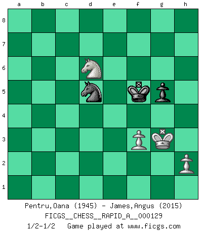 Last move : 1/2-1/2 2012 December 20 20:44:4 [Event "FICGS__CHESS__RAPID_A__000129"] [Site "FICGS"] [Date "2012.09.07"] [Round "1"] [White "Pentru,Oana"] [Black "James,Angus"] [Result "1/2-1/2"] [WhiteElo "1945"] [BlackElo "2015"] 1.e4 c5 2.Nf3 d6 3.d4 cxd4 4.Nxd4 Nf6 5.Nc3 a6 6.Be3 e5 7.Nb3 Be6 8.f3 h5 9.Nd5 Bxd5 10.exd5 Qc7 11.c4 a5 12.Nd2 Nbd7 13.Nb1 Nc5 14.Be2 Be7 15.Nc3 O-O 16.Qc2 Rfe8 17.Rd1 h4 18.O-O Nh5 19.Nb5 Qc8 20.Qd2 Ra6 21.b3 Bd8 22.Rfe1 Qd7 23.Qc2 Bb6 24.Kh1 Nf4 25.Bf1 Ng6 26.a3 Rc8 27.b4 axb4 28.axb4 Na4 29.Bxb6 Nxb6 30.c5 R6a8 31.Bd3 dxc5 32.bxc5 h3 33.Nd6 hxg2+ 34.Qxg2 Rxc5 35.Nxf7 Nf4 36.Nxe5 Nxg2 37.Nxd7 Nxe1 38.Nxc5 Nxd3 39.Rxd3 Ra5 40.Nxb7 Rxd5 41.Rxd5 Nxd5 42.Nd6 Kh7 43.Kg2 g5 44.Nf5 Kg6 45.Nd6 Nf4+ 46.Kg3 Nd5 47.Nc4 Kf5 48.Nd6+ 1/2-1/2 Sicilian : Najdorf, Byrne (English) attack Kingside Castling by player Black (move 15) Kingside Castling by player White (move 18) 10 pieces endgame at move 40 : White KRNPPP , Black KRNP WHITE : King + 1 Rook 1 Knight 3 Pawns BLACK : King + 1 Rook 1 Knight 1 Pawn 9 pieces endgame at move 40 : White KRNPP , Black KRNP WHITE : King + 1 Rook 1 Knight 2 Pawns BLACK : King + 1 Rook 1 Knight 1 Pawn 8 pieces endgame at move 41 : White KRNPP , Black KNP WHITE : King + 1 Rook 1 Knight 2 Pawns BLACK : King + 1 Knight 1 Pawn 7 pieces endgame at move 41 : White KNPP , Black KNP WHITE : King + 1 Knight 2 Pawns BLACK : King + 1 Knight 1 Pawn This chess game ended in a draw. Follow this game move after move (download)He who fears an isolated Queen's Pawn should give up Chess. (Siegbert Tarrasch) Wie, soll nun auch die Opposition abgeschafft werden? Ja, es tut mir leid, Ihnen diesen Schmerz nicht ersparen zu können. (Aaron Nimzowitsch) El hombre es un frívolo, una creatura engañosa y como un jugador de Ajedrez, se preocupa mas por el proceso de obtener su meta que de la meta por sí misma. (Dostoyevsky) Il s'avisa de me proposer d'apprendre les échecs qu'il jouait un peu... me voilà forcené des échecs. J'achète un échiquier, je m'enferme dans ma chambre, j'y passe des jours et des nuits à vouloir apprendre par cur toutes les parties. (Jean-Jacques Rousseau, Confessions) Happy endings are just stories that haven't finished yet. (Jane Smith in Mr & Mrs Smith)