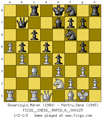 Last move : 1/2-1/2 2012 October 8 15:0:51 [Event "FICGS__CHESS__RAPID_A__000129"] [Site "FICGS"] [Date "2012.09.07"] [Round "1"] [White "Skwarczylo,Marek"] [Black "Pentru,Oana"] [Result "1/2-1/2"] [WhiteElo "1984"] [BlackElo "1945"] 1.d4 d5 2.Nf3 Nf6 3.c4 c6 4.e3 Bf5 5.Nc3 e6 6.Qb3 Qb6 7.c5 Qc7 8.Nh4 Bg6 9.Nxg6 hxg6 10.g3 Nbd7 11.Bg2 Be7 12.O-O b6 13.cxb6 axb6 14.Bd2 e5 15.Rfc1 Qa7 16.Ne2 Qa6 17.Qd1 Rc8 18.Bc3 e4 19.Bf1 g5 20.a4 Qb7 21.b4 Nf8 22.a5 b5 1/2-1/2 Queen's pawn game Kingside Castling by player White (move 12) This chess game ended in a draw. Follow this game move after move (download)Many have become Chess Masters, no one has become the Master of Chess. (Siegbert Tarrasch) Pläne sind die Träume des Verständigen. (Ernst Freiherr von Feuchtersleben) El estómago es una parte esencial del maestro de Ajedrez. (Bent Larsen) D'abord les bases : Jouez et étudiez, puis étudiez et jouez, ensuite jouez et étudiez, puis étudiez et jouez. Deuxièmement : Donnez toujours le meilleur de vous-même ! (Ken Smith) Computers are like Old Testament gods; lots of rules and no mercy. (Joseph Campbell)