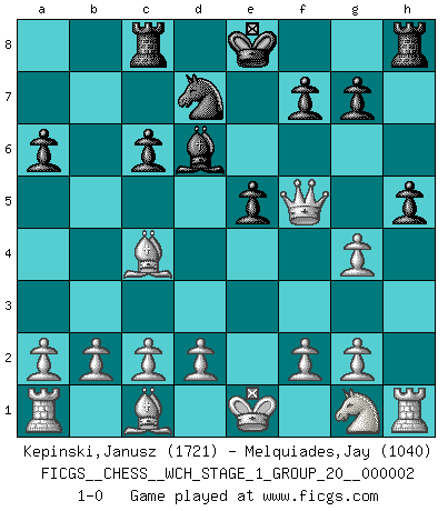 Last move : 1-0 2007 March 20 17:24:16 [Event "FICGS__CHESS__WCH_STAGE_1_GROUP_20__000002"] [Site "FICGS"] [Date "2007.01.16"] [Round "1"] [White "Kepinski,Janusz"] [Black "Melquiades,Jay"] [Result "1-0"] [WhiteElo "1721"] [BlackElo "1040"] 1.e4 e5 2.Bc4 d5 3.exd5 Nf6 4.Nc3 c6 5.Qf3 Bg4 6.Qg3 Qd6 7.Ne4 h5 8.Nxd6+ Bxd6 9.h3 Ne4 10.dxc6 bxc6 11.Qd3 a6 12.hxg4 Nd7 13.Qxe4 Rc8 14.Qf5 1-0 Bishop's Opening Player White won this chess game. Follow this game move after move (download)You have to have the fighting spirit. You have to force moves and take chances. (Bobby Fischer) Wie kann ich Remis annehmen? Ich weiß ja gar nicht, wie ich stehe! (Fritz Sämisch) Haz el enroque temprano y seguido. (Rob Sillars) Ce qui est bien, c'est d'avoir tout un tas de pièces en prise : l'adversaire ne peut en prendre qu'une à la fois. Cité par Thierry Audin. I don't diet. I just don't eat as much as I'd like to. (Linda Evangelista, supermodel)
