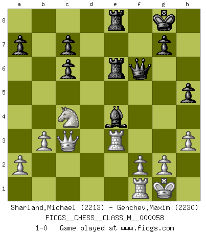 Last move : 1-0 2013 March 29 11:51:57 [Event "FICGS__CHESS__CLASS_M__000058"] [Site "FICGS"] [Date "2012.09.12"] [Round "1"] [White "Sharland,Michael"] [Black "Genchev,Maxim"] [Result "1-0"] [WhiteElo "2213"] [BlackElo "2230"] 1.e4 e5 2.Bc4 Nf6 3.d4 exd4 4.Nf3 Nc6 5.e5 d5 6.Bb5 Ne4 7.Nxd4 Bd7 8.Bxc6 bxc6 9.O-O Bc5 10.Be3 Qe7 11.Re1 O-O 12.Nd2 f5 13.exf6 Nxf6 14.N4f3 Bxe3 15.Rxe3 Qd6 16.c4 Bf5 17.Qc1 Ng4 18.Rc3 Be4 19.cxd5 Bxd5 20.h3 Ne5 21.Nxe5 Qxe5 22.Nc4 Qf6 23.Qc2 Rae8 24.Rf1 Be4 25.Qc1 Re6 26.b3 h5 27.Re3 Rfe8 28.Qc3 1-0 Bishop's Opening : Urusov gambit Kingside Castling by player White (move 9) Kingside Castling by player Black (move 11) Player White won this chess game. Follow this game move after move (download)A passed Pawn increases in strength as the number of pieces on the board diminishes. (Capablanca) Jeder Schachmeister war einmal ein Anfänger. (Irving Chernev) La señal de un Gran Maestro es su habilidad de ganar una partida rápidamente y sin dolor. (Irving Chernev) Aucun coup ne doit être joué sans but. (Pedro Damiano) Quotation,n.: The act of repeating erroneously the words of another. The words erroneously repeated. (Ambrose Bierce, The Devil's Dictionary)