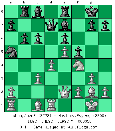 Last move : 0-1 2013 March 3 16:47:31 [Event "FICGS__CHESS__CLASS_M__000058"] [Site "FICGS"] [Date "2012.09.12"] [Round "1"] [White "Lubas,Jozef"] [Black "Novikov,Evgeny"] [Result "0-1"] [WhiteElo "2273"] [BlackElo "2200"] 1.d4 Nf6 2.c4 e6 3.Nf3 d5 4.g3 Be7 5.Bg2 dxc4 6.Qa4+ Nc6 7.Nc3 O-O 8.Qxc4 Ne8 9.O-O Nd6 10.Qd3 Nb4 11.Qd1 Nd5 12.Ne5 c6 13.e4 Nxc3 14.bxc3 f6 15.Nd3 Nc4 16.Qb3 Na5 17.Qc2 b6 18.Rd1 Qd7 19.e5 f5 20.Nf4 Rb8 21.Qe2 Re8 0-1 Queen's pawn game Kingside Castling by player Black (move 7) Kingside Castling by player White (move 9) Player Black won this chess game. Follow this game move after move (download)Modern Chess is too much concerned with things like Pawn structure. Forget it, Checkmate ends the game. (Nigel Short) Glücklicherweise sind Großmeister Ruben Fines reine Schachbücher weniger phallozentrisch [als seine Schachpsychologie] und deswegen auch weniger lächerlich. (Nigel Short) Buenas posiciones no logran ganar juegos, buenas movidas sí. (Gerald Abrahams) Le profane ne songe pas à la somme de jouissance dont il se prive, qui méconnaît ce jeu aux ressources aussi variées que passionnantes. (Jean-Marie Jeanton-Lamarche) A belief is an idea the mind possesses, an idea that possesses the mind. (Robert Oxden Bolton)