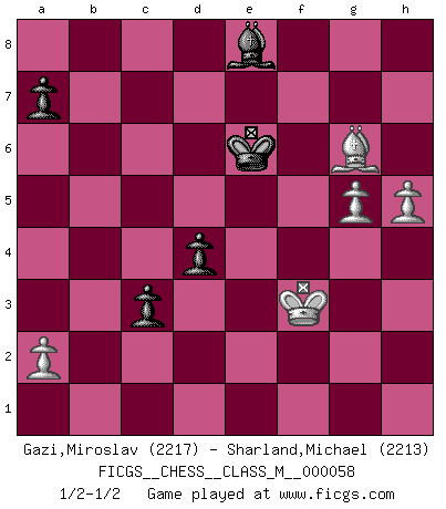 Last move : 1/2-1/2 2013 August 29 10:56:13 [Event "FICGS__CHESS__CLASS_M__000058"] [Site "FICGS"] [Date "2012.09.12"] [Round "1"] [White "Gazi,Miroslav"] [Black "Sharland,Michael"] [Result "1/2-1/2"] [WhiteElo "2217"] [BlackElo "2213"] 1.d4 d5 2.Nf3 Nf6 3.c4 e6 4.Nc3 c6 5.Bg5 h6 6.Bh4 dxc4 7.e4 g5 8.Bg3 b5 9.Be2 Bb7 10.e5 Nd5 11.O-O Nd7 12.Nxd5 cxd5 13.Ne1 Bg7 14.f4 O-O 15.fxg5 hxg5 16.Nf3 f6 17.Qd2 Qe7 18.exf6 Bxf6 19.Qe3 Rae8 20.Rae1 g4 21.Ne5 Bg5 22.Bf4 Bxf4 23.Rxf4 Rxf4 24.Qxf4 Nxe5 25.Qxe5 Qg7 26.Qxg7+ Kxg7 27.Bxg4 Kf6 28.Kf2 b4 29.h4 e5 30.Bh5 Re7 31.g4 Kg7 32.Rxe5 Rxe5 33.dxe5 c3 34.bxc3 bxc3 35.Ke2 d4 36.e6 Kf6 37.g5+ Kxe6 38.Bg6 Ba6+ 39.Kf3 Bb5 40.h5 Be8 1/2-1/2 Queen's pawn game Kingside Castling by player White (move 11) Kingside Castling by player Black (move 14) 10 pieces endgame at move 37 : White KBPPP , Black KBPPP WHITE : King + 1 Bishop 3 Pawns BLACK : King + 1 Bishop 3 Pawns This chess game ended in a draw. Follow this game move after move (download)Many have become Chess Masters, no one has become the Master of Chess. (Siegbert Tarrasch) Kleine Schachspieler machen Mist, und große Schachspieler machen Mist, aber große machen weniger Mist. (Fritz Sämisch) No hay un Gran Maestro de Ajedrez que sea normal; solo se diferencían ellos por la magnitud de su locura. (Viktor Korchnoi) Le temps de noter son nom sur la feuille de partie, j'étais déjà en zeitnot ! D'un modeste amateur apparié lors de la première ronde d'un open contre le grand-maître Azmaïparashvili. Establishing goals is all right if you don't let them deprive you of interesting detours. (Doug Larson)