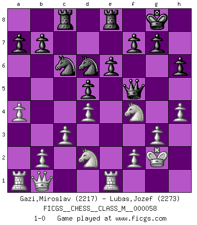 Last move : 1-0 2013 March 7 5:1:53 [Event "FICGS__CHESS__CLASS_M__000058"] [Site "FICGS"] [Date "2012.09.12"] [Round "1"] [White "Gazi,Miroslav"] [Black "Lubas,Jozef"] [Result "1-0"] [WhiteElo "2217"] [BlackElo "2273"] 1.d4 Nf6 2.Bg5 Ne4 3.Bf4 d5 4.e3 c5 5.Bd3 cxd4 6.exd4 Nc6 7.c3 Bf5 8.Ne2 e6 9.O-O Bd6 10.Re1 O-O 11.Bxd6 Nxd6 12.Bxf5 Nxf5 13.Nd2 Re8 14.Nf4 Qg5 15.g3 Rac8 16.a4 Nd6 17.h4 Qf5 18.Kg2 h6 19.Qb1 1-0 Trompowsky attack (Ruth, Opovcensky Opening) Kingside Castling by player White (move 9) Kingside Castling by player Black (move 10) Player White won this chess game. Follow this game move after move (download)When you play Bobby, it is not a question if you win or lose. It is a question if you survive. (Boris Spassky) Wer wird heute Abend ihr Gegner sein? -- Heute Abend spiele ich gegen die schwarzen Steine. (Akiba Rubinstein) En el Ajedrez, tal como en la vida, las bendiciones de hoy pueden ser el veneno del mañana. (Assaic) Il n'y a plus de joueurs du niveau de Jacob Murray dont la seule quête est le beau jeu, le plaisir de voir les pièces construire quelque chose. Sur 10 idées à la minute, 9 seront sans intérêt, la dernière s'avèrera géniale. (Christian Bauer) There is a very easy way to return from a casino with a small fortune : go there with a large one. (Jack Yelton)