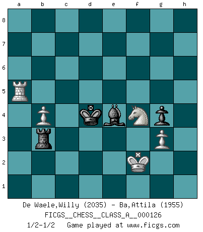 Last move : 1/2-1/2 2012 October 15 18:1:37 [Event "FICGS__CHESS__CLASS_A__000126"] [Site "FICGS"] [Date "2012.09.12"] [Round "1"] [White "De Waele,Willy"] [Black "Ba,Attila"] [Result "1/2-1/2"] [WhiteElo "2035"] [BlackElo "1955"] 1.e4 e5 2.Nf3 Nc6 3.Bb5 a6 4.Ba4 Nf6 5.O-O d6 6.Bxc6+ bxc6 7.d4 exd4 8.Qxd4 Be7 9.e5 c5 10.Qd3 dxe5 11.Qxd8+ Bxd8 12.Nxe5 Nd5 13.Nd3 Be7 14.Nf4 Nb4 15.Na3 g5 16.Nh5 Bg4 17.Ng7+ Kf8 18.f3 Bd7 19.Nh5 f6 20.f4 g4 21.f5 Kf7 22.Bh6 Rad8 23.Rf2 Bc8 24.Nc4 Rhg8 25.Raf1 Bd6 26.Nxd6+ cxd6 27.Bf4 Nc6 28.b3 Ne5 29.c4 d5 30.Bxe5 fxe5 31.Re1 Rge8 32.cxd5 Rxd5 33.Ng3 Red8 34.Rfe2 Kf6 35.Ne4+ Kf7 36.Nc3 Rd3 37.Rc1 Bb7 38.Rxe5 Rd2 39.Re2 Rxe2 40.Nxe2 Rd2 41.Nf4 Rxa2 42.Rxc5 Be4 43.g3 Rb2 44.Rc7+ Kf6 45.Rxh7 Bxf5 46.Rh6+ Ke5 47.Rxa6 Rb1+ 48.Kf2 Rb2+ 49.Kf1 Be4 50.Ra7 Rxh2 51.Ra4 Rb2 52.b4 Rb3 53.Ra5+ Kd4 54.Kf2 Rf3+ 55.Ke1 Rb3 56.Kf2 1/2-1/2 Ruy Lopez : Steinitz defense deferred (Russian defense) Kingside Castling by player White (move 5) 10 pieces endgame at move 47 : White KRNPPP , Black KRBP WHITE : King + 1 Rook 1 Knight 3 Pawns BLACK : King + 1 Rook 1 Bishop 1 Pawn 9 pieces endgame at move 50 : White KRNPP , Black KRBP WHITE : King + 1 Rook 1 Knight 2 Pawns BLACK : King + 1 Rook 1 Bishop 1 Pawn This chess game ended in a draw. Follow this game move after move (download)What would Chess be without silly mistakes ? (Kurt Richter) Es hat in meinem Leben Zeiten gegeben, da ich sehr nahe daran war zu glauben, daß ich auch nicht eine einzige Schachpartie verlieren könnte. (José Raúl Capablanca) Morphy probablemente fue el genio más grande de todos. (Bobby Fischer) Le jeu d'échecs est comme rejeté hors du temps. (Antoine de Saint-Exupéry) Life is pain my dear and anyone who says otherwise is selling something. (Princess Bride)