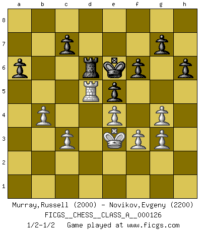 Last move : 1/2-1/2 2013 May 3 22:33:17 [Event "FICGS__CHESS__CLASS_A__000126"] [Site "FICGS"] [Date "2012.09.12"] [Round "1"] [White "Murray,Russell"] [Black "Novikov,Evgeny"] [Result "1/2-1/2"] [WhiteElo "2000"] [BlackElo "2200"] 1.e4 d6 2.d4 Nf6 3.Nc3 e5 4.Nf3 Nbd7 5.Bc4 Be7 6.O-O O-O 7.Re1 a6 8.a4 exd4 9.Qxd4 Ng4 10.Nd5 Nde5 11.Nxe5 dxe5 12.Nxe7+ Qxe7 13.Qc3 Qh4 14.Qg3 Qxg3 15.hxg3 Re8 16.f3 Nf6 17.Be3 Be6 18.Bxe6 Rxe6 19.Red1 Rc6 20.Rac1 Kf8 21.g4 h6 22.Kf2 Ke7 23.Ke2 b5 24.Rd2 bxa4 25.Ra1 Rb8 26.c3 Ne8 27.Rxa4 Nd6 28.Kd3 Rd8 29.Kc2 Nc4 30.Rxd8 Nxe3+ 31.Kd3 Kxd8 32.Kxe3 f6 33.Ra5 Rd6 34.b4 Kd7 35.Rd5 Ke7 36.g3 Ke6 37.Rc5 Kd7 38.Rd5 Ke6 39.Rc5 Kd7 40.Rd5 Ke6 1/2-1/2 Pirc defense Kingside Castling by player White (move 6) Kingside Castling by player Black (move 6) This chess game ended in a draw. Follow this game move after move (download)No one ever won a game by resigning. (Unknown) Ich bin Weltmeister und muß mit niemandem irgend etwas diskutieren. (Viswanathan Anand) El Ajedrez es un terrible juego. Si no controlas el centro, tu oponente tiene una posición mas holgada. Si tienes control del centro, ¡entonces realmente tu tienes algo de que preocuparte!. (Siegbert Tarrasch) Ce n'est pas pour s'amuser qu'il joue aux échecs : il célèbre un culte. (Vladimir Nabokov) At last I discovered the true beauty of chess. So I proposed to her. (Dinesh De Silva)