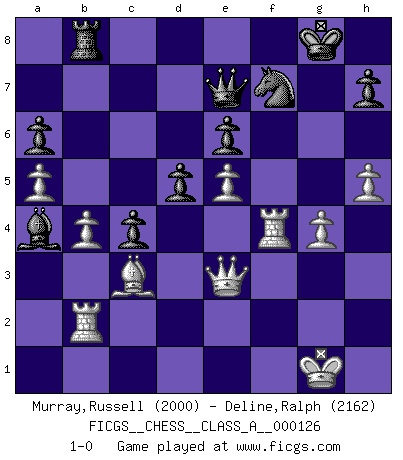 Last move : 1-0 2012 December 31 7:38:32 [Event "FICGS__CHESS__CLASS_A__000126"] [Site "FICGS"] [Date "2012.09.12"] [Round "1"] [White "Murray,Russell"] [Black "Deline,Ralph"] [Result "1-0"] [WhiteElo "2000"] [BlackElo "2162"] 1.e4 e6 2.d4 d5 3.e5 c5 4.c3 Nc6 5.Nf3 Bd7 6.Be2 Nge7 7.Na3 cxd4 8.cxd4 Nf5 9.Nc2 Be7 10.O-O O-O 11.Bd2 Rc8 12.b4 a6 13.a4 Na7 14.Bd3 b5 15.a5 Nc6 16.Rc1 f6 17.Qe2 fxe5 18.dxe5 Qe8 19.g4 Nh6 20.Nfd4 g5 21.Nxc6 Rxc6 22.Nd4 Rc4 23.Bxc4 bxc4 24.Bc3 Qg6 25.Rb1 Rb8 26.Rb2 Nf7 27.Qe3 Nd8 28.h4 Nf7 29.Rd2 Re8 30.h5 Qg7 31.Re2 Qf8 32.Rb2 Rb8 33.Nf5 Ba4 34.f4 gxf4 35.Nxe7+ Qxe7 36.Rxf4 1-0 French : Advance, Euwe variation Kingside Castling by player White (move 10) Kingside Castling by player Black (move 10) Player White won this chess game. Follow this game move after move (download)The stomach is an essential part of the Chess master. (Bent Larsen) Drei Punkte vor allen anderen ist wie einer, der im weißen Anzug posiert, während der Rest in Müllsäcke gekleidet dasteht. (Viktor Kortschnoi) El Ajedrez es tan interesante por sí solo, que no es necesario un interés monetario para persuadir a una persona a que lo practique; por lo tanto, nunca se juega por dinero. (Benjamin Franklin) Horreur, mais aussi harmonie suprême : qu'y avait-il en effet au monde en dehors des échecs ? Le brouillard, l'inconnu, le non-être... (Vladimir Nabokov) Gambling : The sure way of getting nothing from something. (Wilson Mizner)