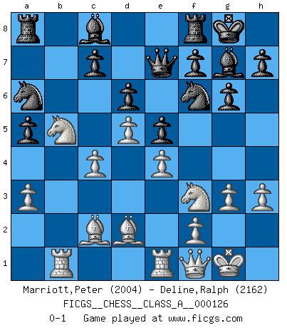 Last move : 0-1 2013 February 4 1:46:43 [Event "FICGS__CHESS__CLASS_A__000126"] [Site "FICGS"] [Date "2012.09.12"] [Round "1"] [White "Marriott,Peter"] [Black "Deline,Ralph"] [Result "0-1"] [WhiteElo "2004"] [BlackElo "2162"] 1.d4 Nf6 2.c4 g6 3.Nc3 Bg7 4.e4 d6 5.Nf3 O-O 6.h3 e5 7.d5 a5 8.Bd3 Na6 9.O-O b6 10.Bc2 Nc5 11.Rb1 Ba6 12.b3 Qe7 13.a3 Nh5 14.Re1 Nf4 15.b4 Nd7 16.g3 Nh5 17.Qd3 Bc8 18.Nb5 Nb8 19.Qf1 Nf6 20.Bd2 Na6 21.bxa5 bxa5 0-1 This chess game has been lost on time (started : 2012.09.12 21:44:55) King's Indian : 5.Nf3 Kingside Castling by player Black (move 5) Kingside Castling by player White (move 9) Player Black won this chess game. Follow this game move after move (download)If Chess is a science, it's a most inexact one. If Chess is an art, it is too exacting to be seen as one. If Chess is a sport, it's too esoteric. If Chess is a game, it's too demanding to be just a game. If Chess is a mistress, she's a demanding one. If Chess is a passion, it's a rewarding one. If Chess is life, it's a sad one. (Unknown) Wenn Capablanka heute auf der Schachbühne erscheinen würde, hätte er ein halbes Jahr gebraucht um sich die Schachtheorie anzueignen. Und dann hätte er alles und jeden besiegt. (Mikhail Moiseyevich Botvinik) Yo he agregado estos principios a la ley: pongan los Caballos en acción antes de que los dos Alfiles sean desarrollados. (Emanuel Lasker) Aucun coup ne doit être joué sans but. (Pedro Damiano) There are three kinds of lies: lies, damned lies and statistics. (Mark Twain)