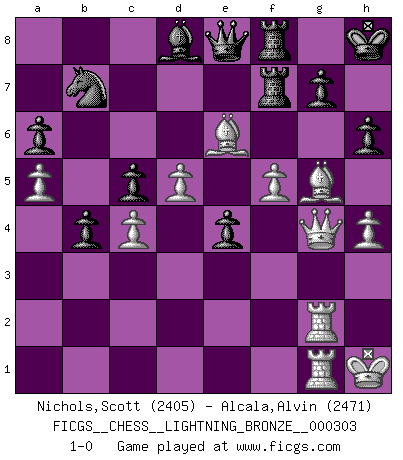 Last move : 1-0 2012 September 13 19:50:54 [Event "FICGS__CHESS__LIGHTNING_BRONZE__000303"] [Site "FICGS"] [Date "2012.09.13"] [Round "1"] [White "Nichols,Scott"] [Black "Alcala,Alvin"] [Result "1-0"] [WhiteElo "2405"] [BlackElo "2471"] 1.e4 c5 2.Nf3 d6 3.Bc4 Nf6 4.Qe2 Nc6 5.O-O Bg4 6.Bb5 Bd7 7.c3 a6 8.Ba4 e5 9.Rd1 b5 10.Bc2 Qc7 11.d4 Be7 12.d5 Na5 13.h3 Nc4 14.b3 Nb6 15.Be3 h6 16.a4 O-O 17.a5 Nc8 18.b4 Nh7 19.Nbd2 Ng5 20.bxc5 dxc5 21.Nf1 Nxf3+ 22.Qxf3 Kh8 23.Ng3 Nd6 24.Qh5 Ne8 25.Rd2 Kg8 26.Nf5 Bxf5 27.Qxf5 Nd6 28.Qg4 Kh7 29.Bd3 Rac8 30.h4 Bf6 31.Rda2 Kh8 32.Bf1 Rce8 33.g3 Bd8 34.Bh3 Nc4 35.Bc1 Qa7 36.Qh5 Kg8 37.Kh2 Qe7 38.Qf3 Bc7 39.Bf1 Nd6 40.Be3 Nb7 41.c4 b4 42.Qg4 Qd6 43.Kh1 Rd8 44.Bh3 Kh8 45.f4 exf4 46.gxf4 f5 47.Qg3 fxe4 48.Rg2 Rf7 49.Be6 Rdf8 50.Qg4 Qe7 51.f5 Bd8 52.Bg5 Qe8 53.Rag1 1-0 Sicilian Kingside Castling by player White (move 5) Kingside Castling by player Black (move 16) Player White won this chess game. Follow this game move after move (download)Of all my Russian books, the defense contains and diffuses the greatest 'warmth' which may seem odd seeing how supremely abstract Chess is supposed to be. (Vladimir Nabokov) Schach wird sich dank seiner hohen kulturellen Tradition immer durchsetzen. In näherer Zukunft womöglich sogar als Gegenreaktion auf die maßlose Reizüberflutung im Freizeit- und Spielbereich. (Garry Kasparov) Solo puedes ser bueno en el Ajedrez si amas al juego. (Bobby Fischer) Mais n'est-ce pas déjà le limiter injurieusement que d'appeler les échecs un jeu? N'est-ce pas aussi une science, un art, ou quelque chose qui, comme le cercueil de Mahomet entre ciel et terre, est suspendu entre l'un et l'autre, et qui réunit un nombre incroyable de contraires ? (Stefan Zweig) Without deviation from the norm, progress is not possible. (Frank Zappa)