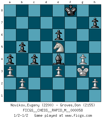 Last move : 1/2-1/2 2012 November 13 14:47:37 [Event "FICGS__CHESS__RAPID_M__000058"] [Site "FICGS"] [Date "2012.09.14"] [Round "1"] [White "Novikov,Evgeny"] [Black "Groves,Don"] [Result "1/2-1/2"] [WhiteElo "2200"] [BlackElo "2155"] 1.d4 Nf6 2.c4 e6 3.Nf3 b6 4.Nc3 Bb4 5.Bd2 Bb7 6.e3 O-O 7.Bd3 d5 8.O-O dxc4 9.Bxc4 c5 10.a3 Bxc3 11.Bxc3 Ne4 12.Rc1 Nd7 13.Qe2 Nxc3 14.Rxc3 a6 15.Ba2 Qf6 16.Rd1 Rfd8 17.d5 b5 18.dxe6 fxe6 19.Rcd3 Nf8 20.Rxd8 Rxd8 21.Rxd8 Qxd8 22.Ne5 c4 23.Bb1 Bxg2 24.Qh5 g6 25.Bxg6 Nxg6 26.Nxg6 Be4 27.Ne5 Qf6 28.Qg4+ Qg7 29.f3 Qxg4+ 30.fxg4 a5 31.Kf2 Kf8 32.Kg3 a4 1/2-1/2 Queen's Indian : 4.Nc3 Kingside Castling by player Black (move 6) Kingside Castling by player White (move 8) This chess game ended in a draw. Follow this game move after move (download)An attack on the wing should be met by play in the center. (Nimzovitch) Je mehr wir mit Computern analysieren, desto mehr glauben wir an Verteidigung. (Vladimir Kramnik) Ciertamente, de todas la drogas del mundo, el Ajedrez debe ser el mas placentero permamentemente. (Assiac) Il a essayé de se convaincre qu'il pourrait empêcher toutes les erreurs et ne jamais perdre. L'horreur ! Gary Kasparov au sujet de Robert Fischer. Tree pose grows confidence. It roots me to this world. (Terri Guillemets)