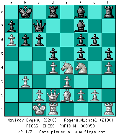 Last move : 1/2-1/2 2012 October 18 19:38:28 [Event "FICGS__CHESS__RAPID_M__000058"] [Site "FICGS"] [Date "2012.09.14"] [Round "1"] [White "Novikov,Evgeny"] [Black "Rogers,Michael"] [Result "1/2-1/2"] [WhiteElo "2200"] [BlackElo "2130"] 1.d4 f5 2.Nc3 Nf6 3.Bg5 d5 4.Bxf6 exf6 5.e3 Be6 6.Bd3 Nc6 7.a3 Qd7 8.Nge2 Ne7 9.Nf4 Bf7 10.h4 h5 11.Be2 g6 12.Qd2 Nc8 13.Qd3 c6 14.a4 Qc7 15.a5 Nd6 16.a6 b6 17.Qd2 O-O-O 18.b3 Kb8 19.O-O-O Ne4 20.Nxe4 1/2-1/2 Dutch Queenside Castling by player Black (move 17) Queenside Castling by player White (move 19) This chess game ended in a draw. Follow this game move after move (download)A good player is always lucky. (Jose Raul Capablanca) Der 70jährige Viktor Kortschnoi: Die Rentenanstalt wollte mich zwingen in Rente zu gehen. Meine Frau erhält jetzt eine Pension- und ich zahle weiter in die Rentenkasse ein! (Viktor Kortschnoi) Siempre es mucho mejor sacrificar las piezas de tu oponente. (Savielly Tartakover) Le pion, dans sa simplicité, marche droit devant lui, mais lorsqu'il prend, il le fait obliquement? Ainsi l'homme, tant qu'il reste pauvre, marche dans la droiture et vit honnêtement, mais lorsqu'il recherche les honneurs, il flatte, se parjure et, par les voies obliques, cherche une position supérieure sur l'échiquier du monde. (Jean de Galles) God, you are such an idiot. - Actually, I thought I was more of a jerk. (Gregory House to Stacy Warner, House M.D.)