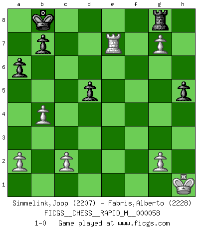 Last move : 1-0 2012 November 12 16:41:49 [Event "FICGS__CHESS__RAPID_M__000058"] [Site "FICGS"] [Date "2012.09.14"] [Round "1"] [White "Simmelink,Joop"] [Black "Fabris,Alberto"] [Result "1-0"] [WhiteElo "2207"] [BlackElo "2228"] 1.e4 d5 2.exd5 Qxd5 3.Nc3 Qa5 4.d4 c6 5.Nf3 Nf6 6.Ne5 Be6 7.Bd3 Nbd7 8.f4 g6 9.O-O Bg7 10.Qe1 Bf5 11.Nc4 Qc7 12.Bxf5 gxf5 13.Ne3 e6 14.Nxf5 Bf8 15.Ng3 O-O-O 16.f5 e5 17.dxe5 Nxe5 18.Nge4 Nd5 19.Kh1 Ng4 20.Qh4 h5 21.Nxd5 cxd5 22.Bf4 Qb6 23.Ng5 Qf6 24.Qe1 Bc5 25.Nxf7 Qxf7 26.Qc3 Qf8 27.Rae1 Rh7 28.b4 Rf7 29.h3 Rxf5 30.hxg4 Rxf4 31.Rxf4 Qxf4 32.Qxc5+ Kb8 33.Qe7 Rh8 34.g5 Qh4 35.Kg1 a6 36.g6 Qd4 37.Kh1 Qc4 38.Re2 Rc8 39.g7 Qf4 40.Qe5+ Qxe5 41.Rxe5 Rg8 42.Re7 1-0 Scandinavian (centre counter) defense Kingside Castling by player White (move 9) Queenside Castling by player Black (move 15) Player White won this chess game. Follow this game move after move (download)The most important feature of the Chess position is the activity of the pieces. This is absolutely fundamental in all phases of the game: Opening, Middlegame and especially Endgame. The primary constraint on a piece's activity is the Pawn structure. (Michael Stean) Die unerbitterlichsten Regeln im Schach sind die Ausnahmen. (Savielly Grigorievitsch Tartakower) Si tu oponente no puede hacer nada activo, entonces no apures la posición; En vez de eso, dejalo estar sentado ahí, sufriendo y rogandote por un empate. (Jeremy Silman) Même si l'adversaire joue le coup analysé précédemment, recommencez l'analyse en voyant la nouvelle position. Première règle de Blumenfeld An expert is a man who has made all the mistakes which can be made in a very narrow field. (Niels Bohr)