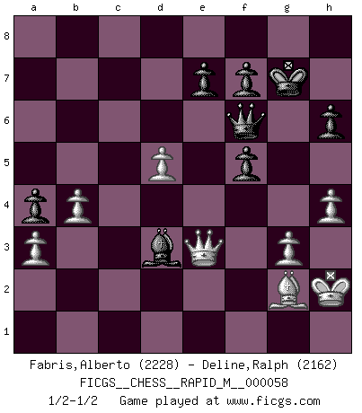 Last move : 1/2-1/2 2012 November 8 20:5:1 [Event "FICGS__CHESS__RAPID_M__000058"] [Site "FICGS"] [Date "2012.09.14"] [Round "1"] [White "Fabris,Alberto"] [Black "Deline,Ralph"] [Result "1/2-1/2"] [WhiteElo "2228"] [BlackElo "2162"] 1.c4 c5 2.g3 g6 3.Bg2 Bg7 4.Nc3 Nc6 5.Nf3 Nf6 6.d4 cxd4 7.Nxd4 O-O 8.O-O Qb6 9.Nc2 d6 10.b3 Qa5 11.Nd5 Nxd5 12.cxd5 Ne5 13.Bd2 Qa6 14.Be3 Ng4 15.Bd4 Bd7 16.Qd2 Bxd4 17.Nxd4 Qb6 18.h3 Nf6 19.Rac1 Rfc8 20.e4 a5 21.Kh2 a4 22.b4 Rxc1 23.Rxc1 Rc8 24.Rxc8 Bxc8 25.Qc3 Bd7 26.f4 Ne8 27.a3 Nc7 28.e5 Nb5 29.Nxb5 Bxb5 30.f5 dxe5 31.Qxe5 Qf6 32.Qb8 Kg7 33.Qxb7 Be2 34.Qa7 gxf5 35.Qe3 Bb5 36.h4 h6 37.Qc5 Bd3 38.Qe3 1/2-1/2 English : Symmetrical variation Kingside Castling by player Black (move 7) Kingside Castling by player White (move 8) This chess game ended in a draw. Follow this game move after move (download)Even the laziest King flees wildly in the face of a double check ! (Aaron Nimzowitsch) Dein Körper muss in Topform sein. Dein Schach verfällt, wenn dein Körper verfällt. Der Körper kann nicht vom Geist getrennt werden. (Robert James Fischer) Todo se encuentra en un estado de flujo y esto incluye al mundo del Ajedrez. (Mikhail Botvinnik) Je ne suis pas le dernier à jouer lâchement des coups douteux pendant le zeïtnot de l'adversaire pour l'achever: en effet les coups qui font le plus peur sont ceux que l'on ne comprend pas. Je me fais souvent peur quand je joue. (Un professeur anonyme) I don't believe in psychology. I believe in good moves. (Bobby Fischer)